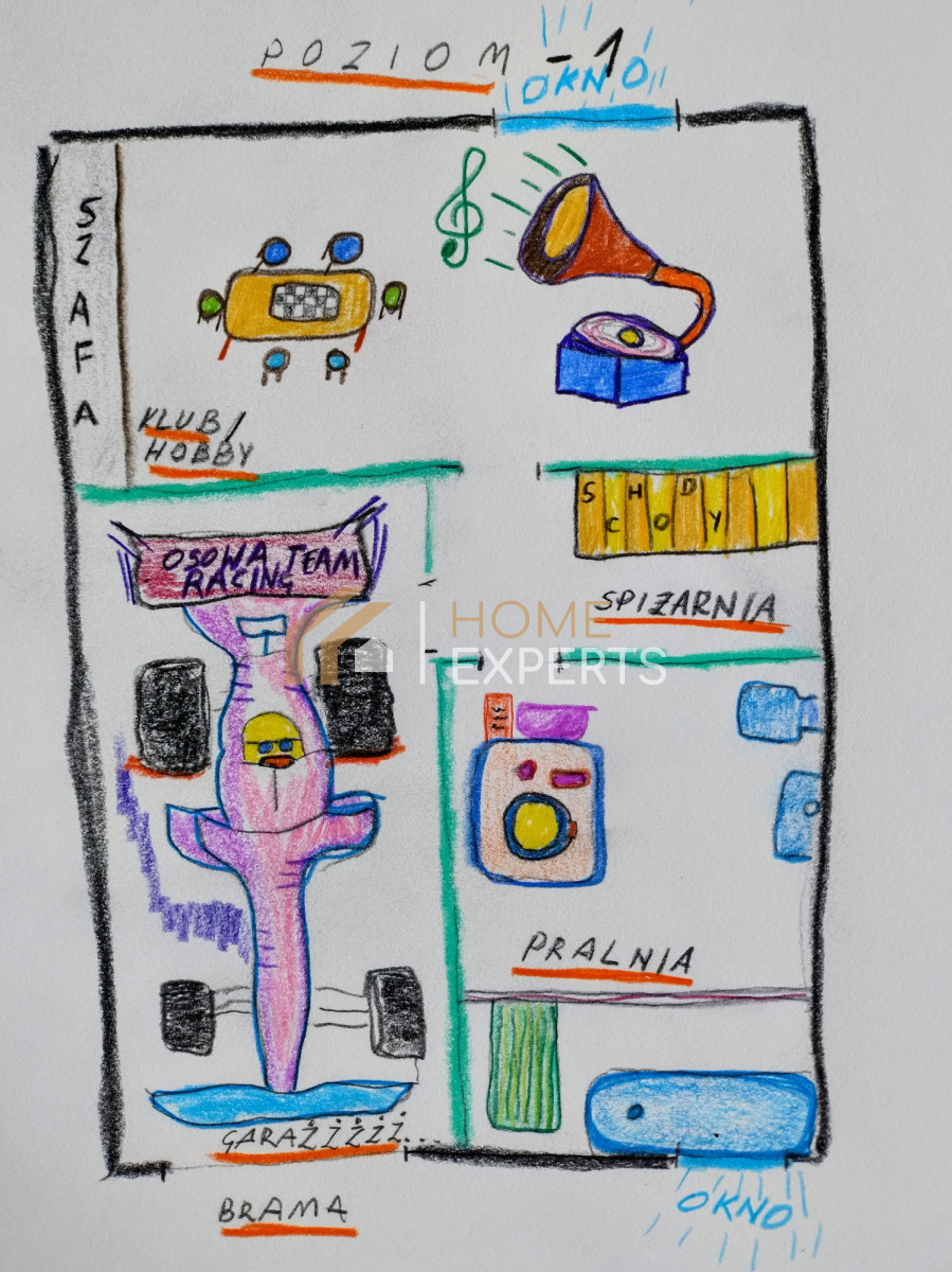 Poziom - 1: korytarz z wejściem do garażu | spiżarnia | pralnia | pokój gier.