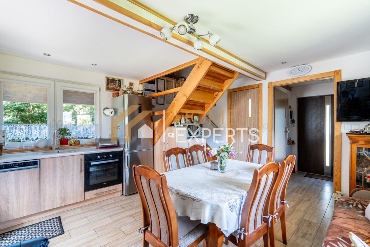 Klimatyczny dom zlokalizowany w cichej i zielonej okolicy w urokliwej, kaszubskiej wsi Gołubie k. Stężycy na terenie Kaszubskiego Parku krajobrazowego. To idealne miejsce, dla ludzi ceniących sobie otoczenie natury, komfort bliskości dużego miasta, miłe sąsiedztwo i dbających o klimatyczny nastrój. Doskonałe miejsce do odpoczynku i zachowania maksymalnej prywatności. Wnętrze spójne i konsekwentne wykonane w tzw. "wiejskim stylu". Wyjątkowy klimat zapewniają m.in. dębowe stropowe belki w rustykalnym stylu oraz urokliwy kominek.