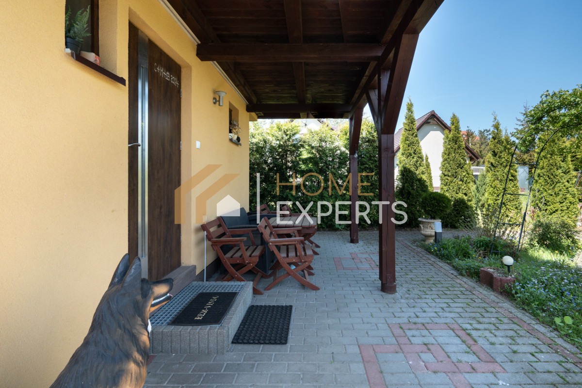 Teren działki budowlanej (1064 m2) w całości ogrodzony z możliwość parkowania kilku samochodów. Ogród ładnie zagospodarowany, z licznymi nasadzeniami oraz elementami małej architektury. Dodatkowo na terenie posesji znajduje się pomieszczenie gospodarcze z werandą - idealne miejsce do przechowywania lub jako nieduże pomieszczenie do biesiadowania.