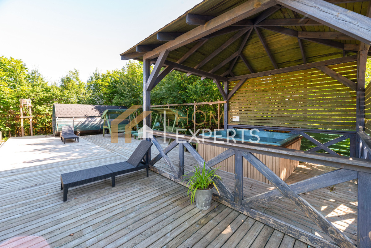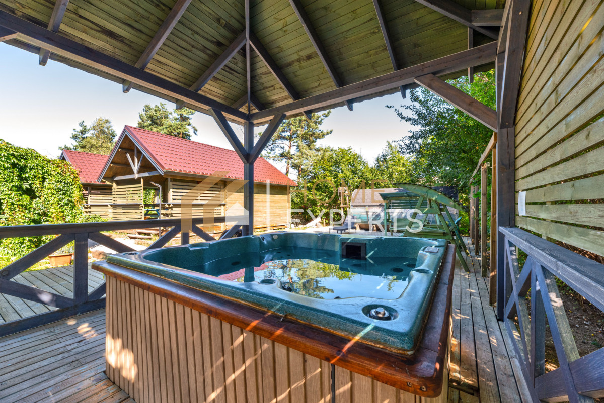 ► Taras relaksacyjny z leżakami plażowymi, huśtawkami, sauną fińską, wiadrem zimnej wody i zadaszonym jacuzzi, całość podświetlona oświetleniem LED