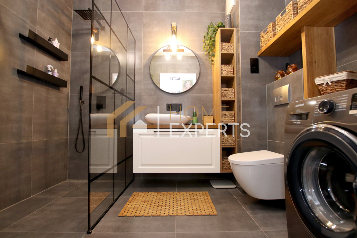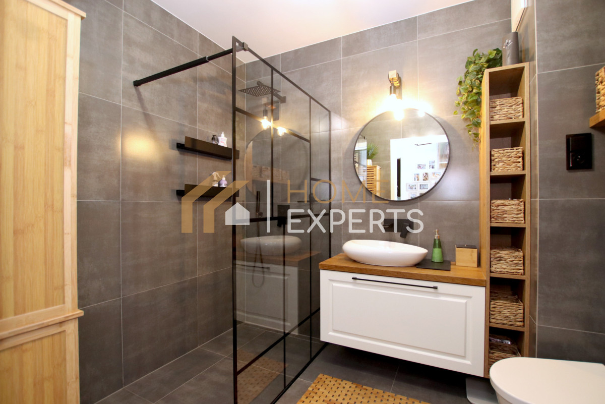 Nieruchomość jest w doskonałej kondycji, nie wymaga nakładów finansowych, utrzymana w jasnej tonacji kolorystycznej ze stylowymi akcentami, w salonie na ścianach naturalna cegła. W całym mieszkaniu na podłogach deska barlinecka, w łazience terakota.