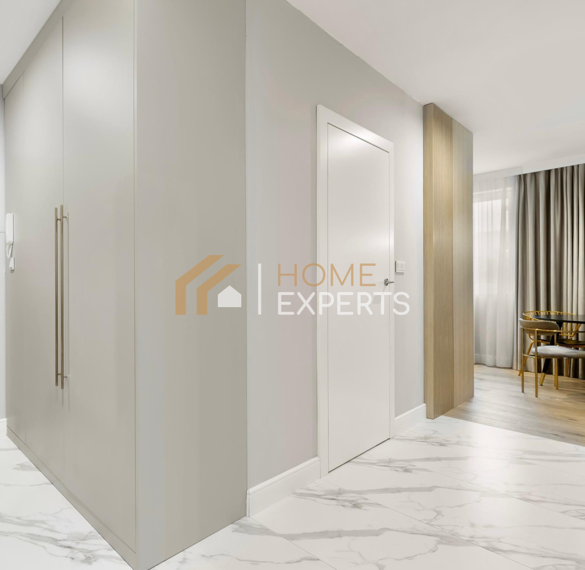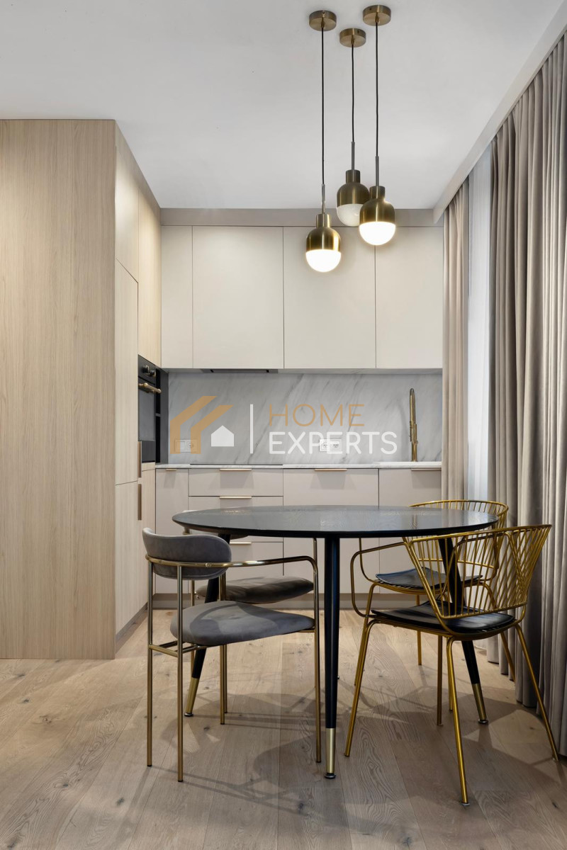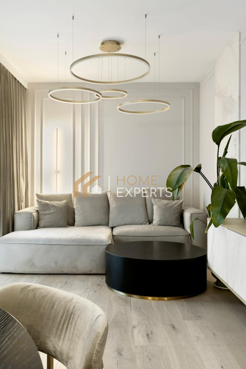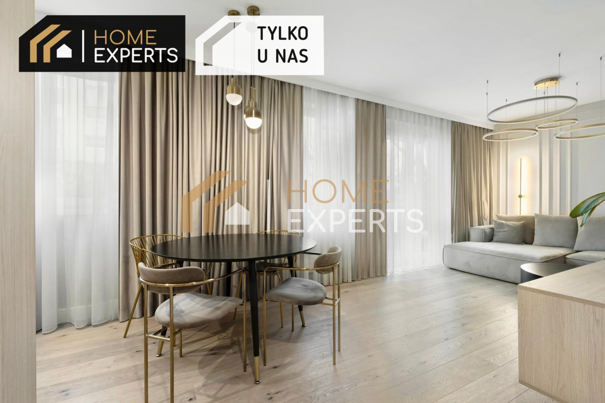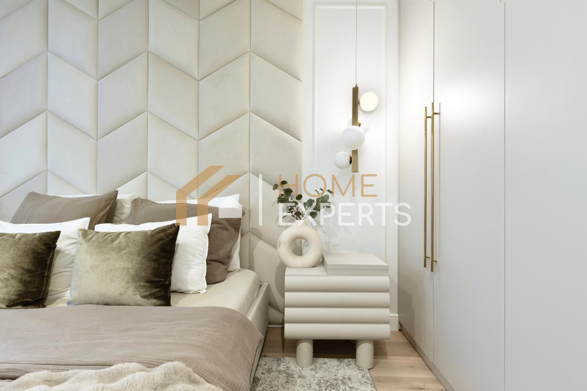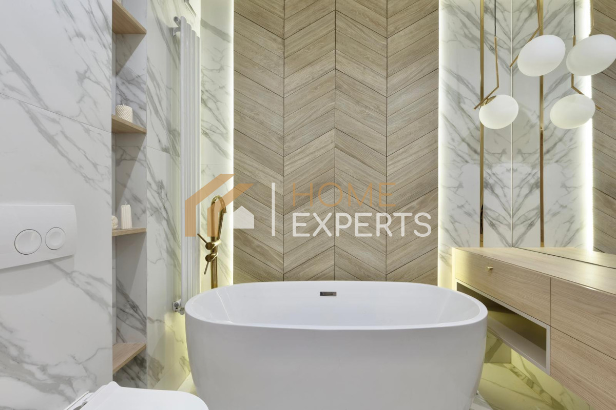 Cała zabudowa meblowa została wykonana na zamówienie przez renomowaną firmę stolarską, co gwarantuje spójność stylistyczną i maksymalne wykorzystanie przestrzeni.