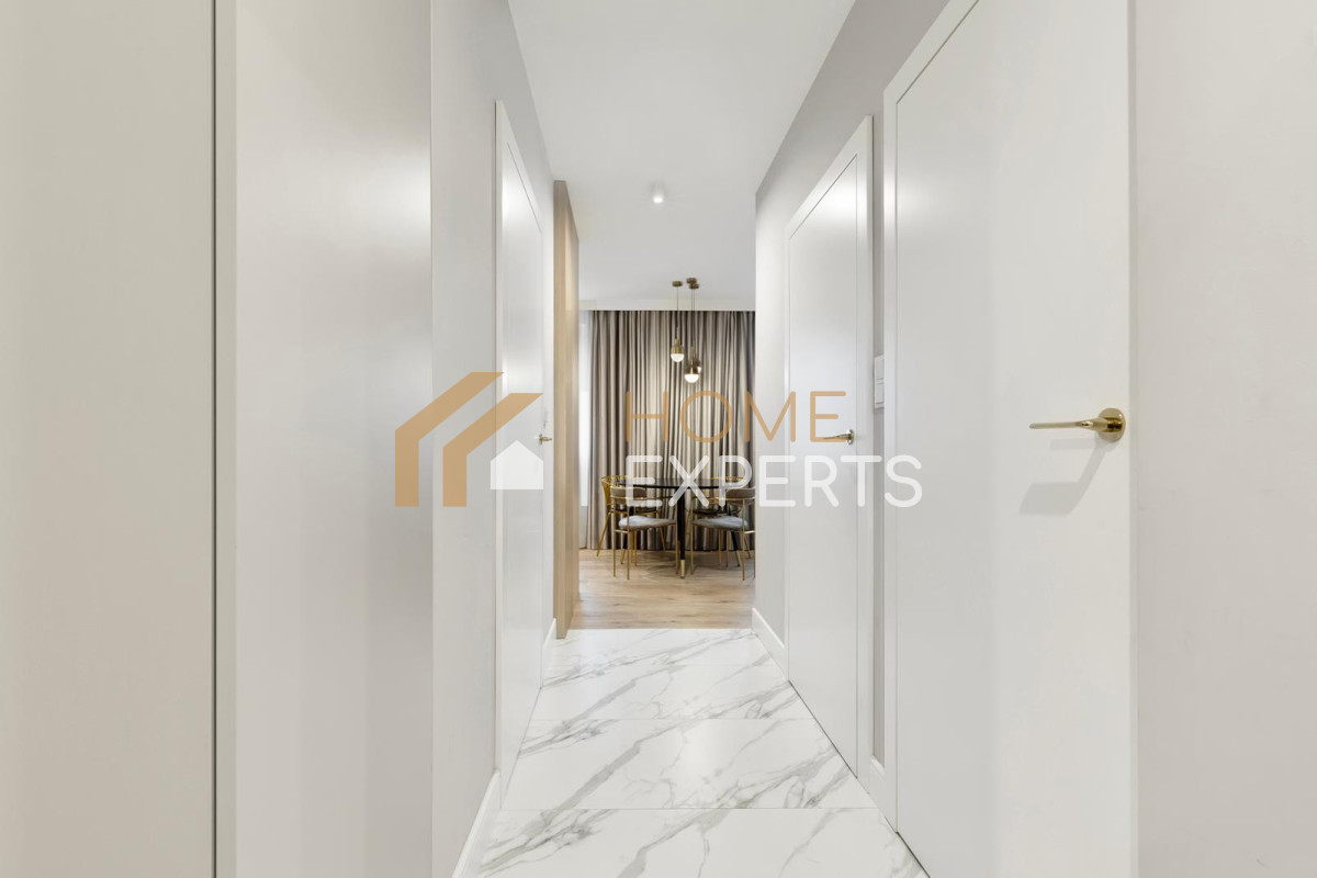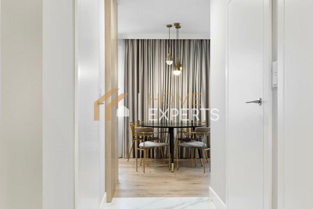 Mieszkanie jest dwustronne, z ekspozycją południowo-zachodnią, dzięki czemu wnętrza są doskonale doświetlone przez większą część dnia.
