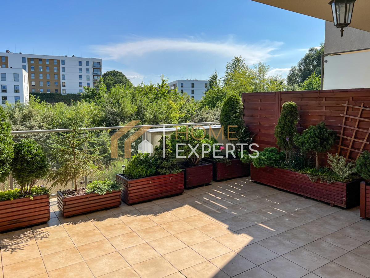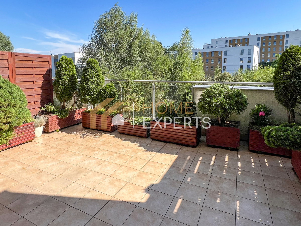 Niewątpliwym atutem tej nieruchomości jest duży, wypełniony kwiatami południowy taras o powierzchni 26,2 m2, z którego rozpościera się piękny widok na zieleń otaczającą nieruchomość.