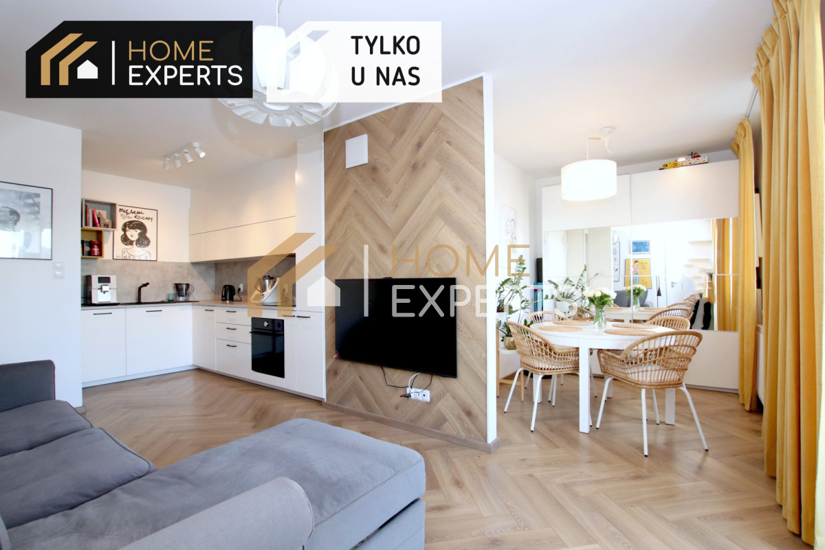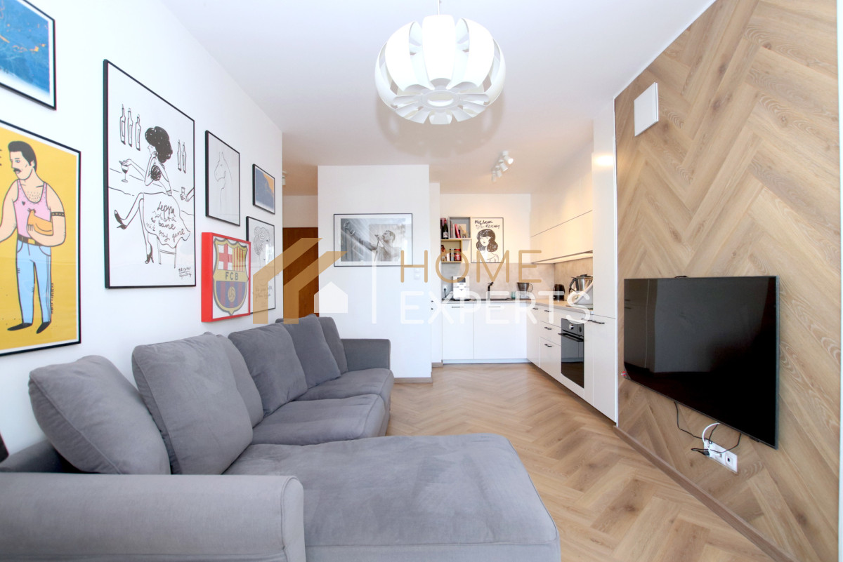 Funkcjonalne i przestronne mieszkanie o powierzchni niespełna 45m², zlokalizowane na pierwszym piętrze nowoczesnego budynku z windą, z 2019 roku, wybudowanego przez dewelopera Hossa.