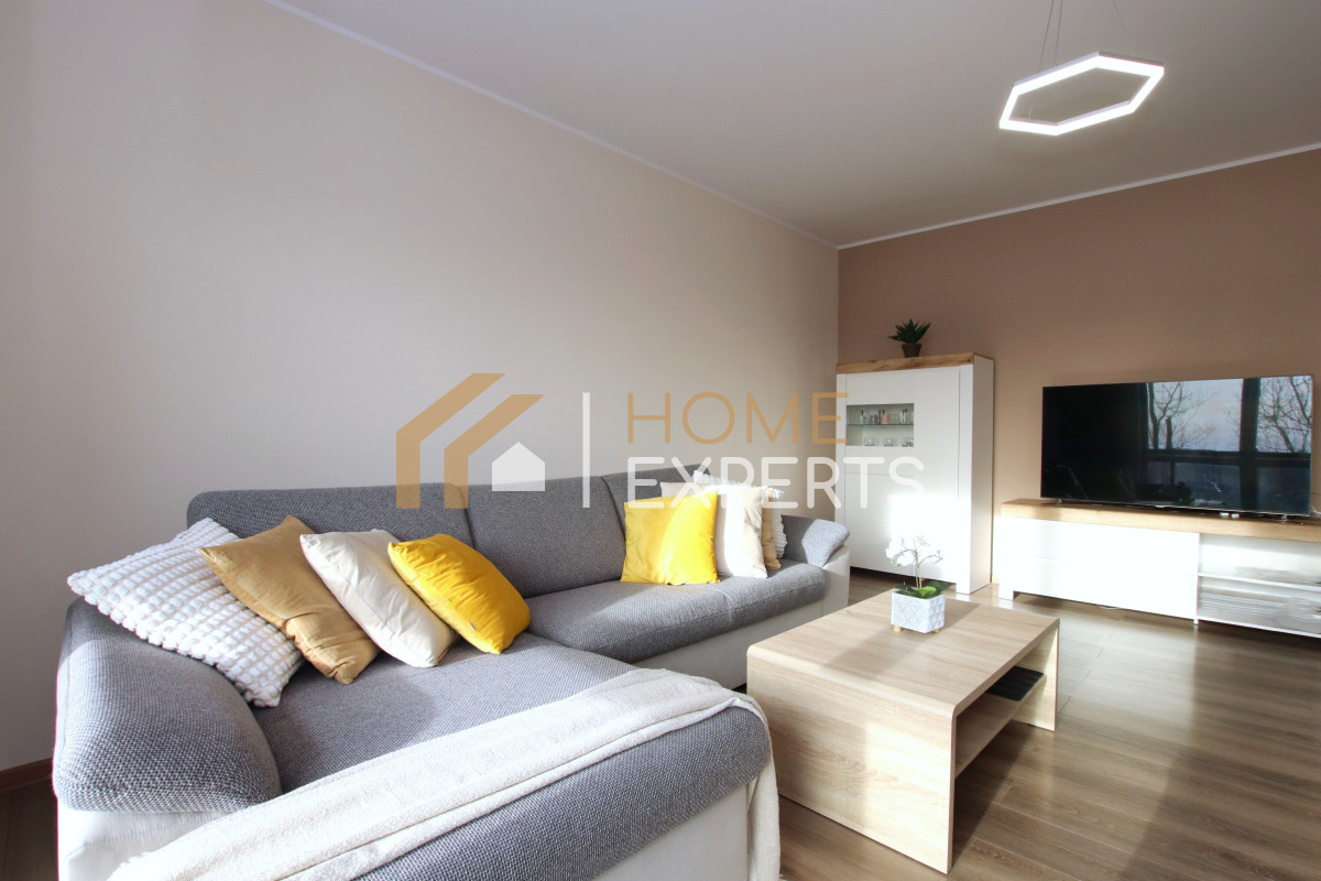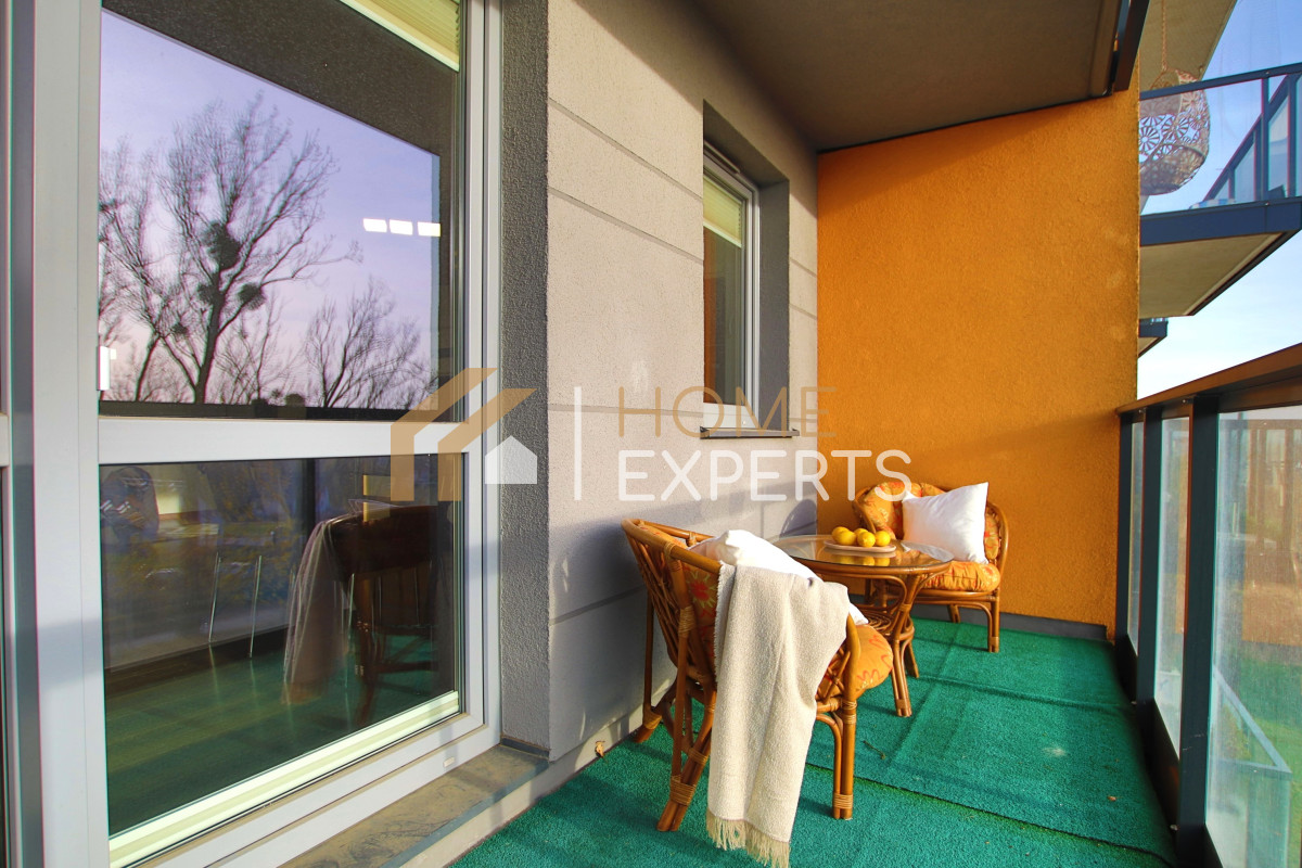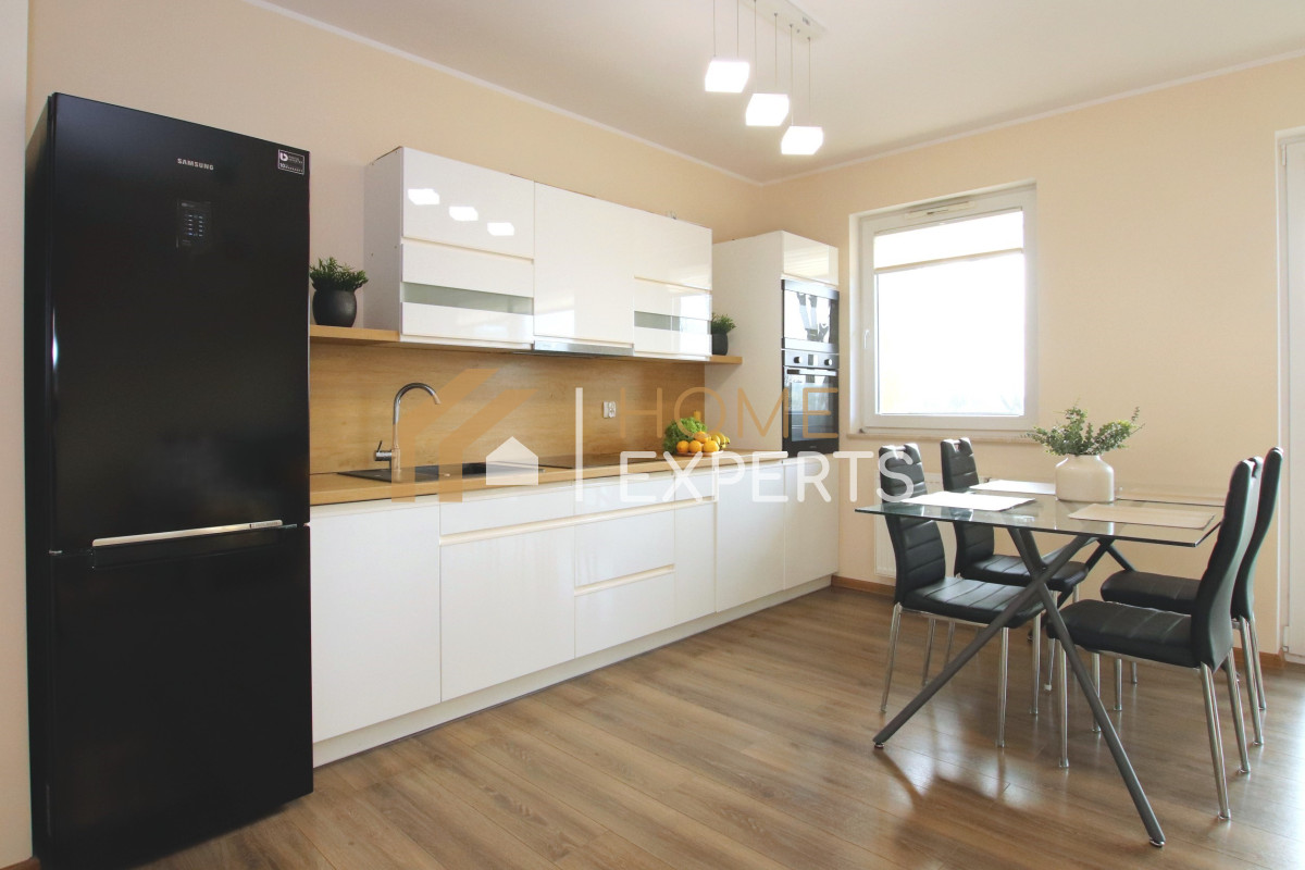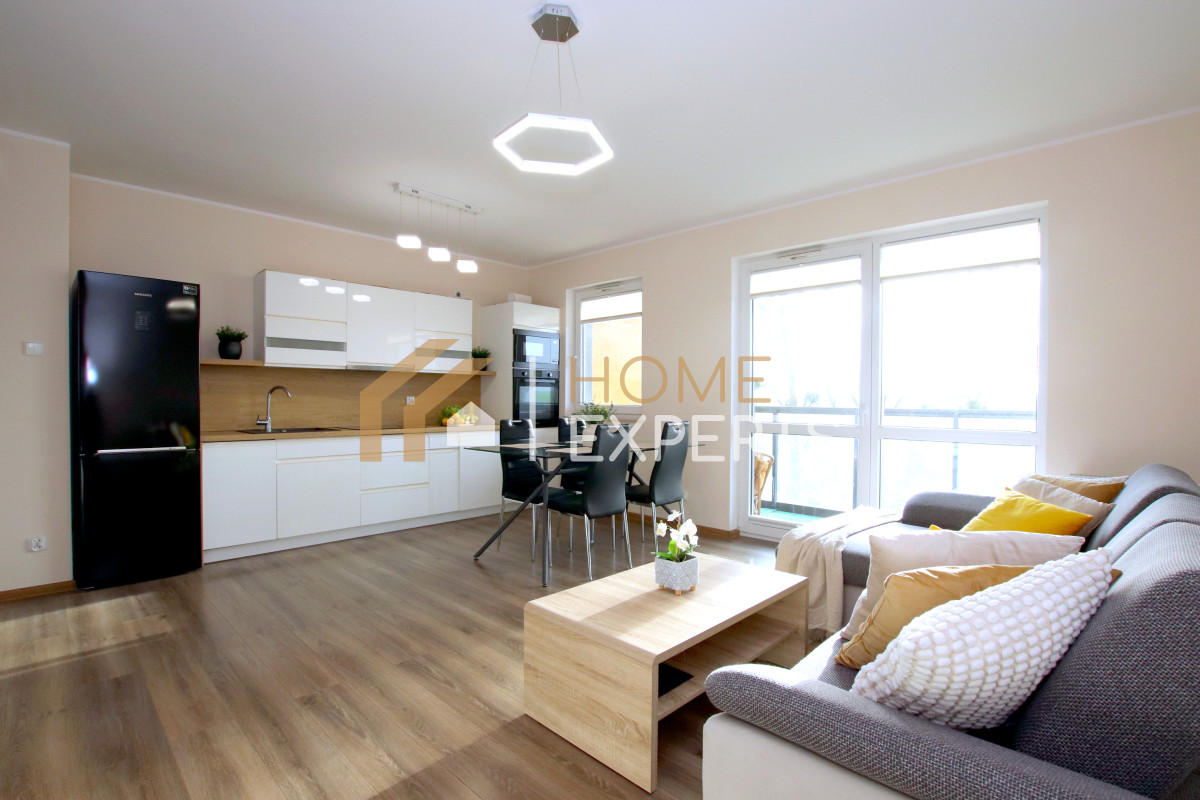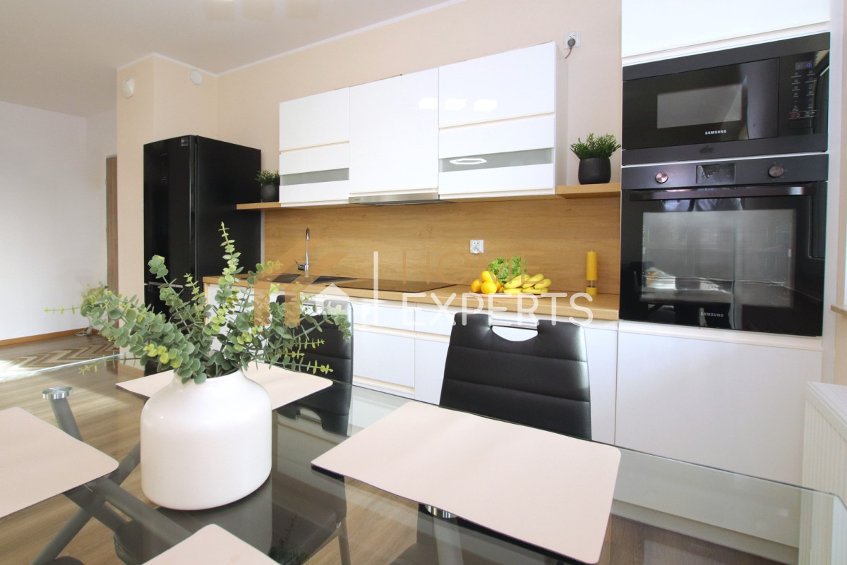 Salon z aneksem kuchennym i z wyjściem na duży balkon z widokiem na zieleń i otwartą przestrzeń. W cenie mieszkania jest zabudowa kuchenna wyposażona w sprzęty AGD (płyta indukcyjna Bosch, piekarnik Samsung, zmywarka Bosch, wbudowana kuchenka mikrofalowa Samsung oraz lodówka Samsung). W cenie mieszkania jest również szafa w zabudowie w przedpokoju.