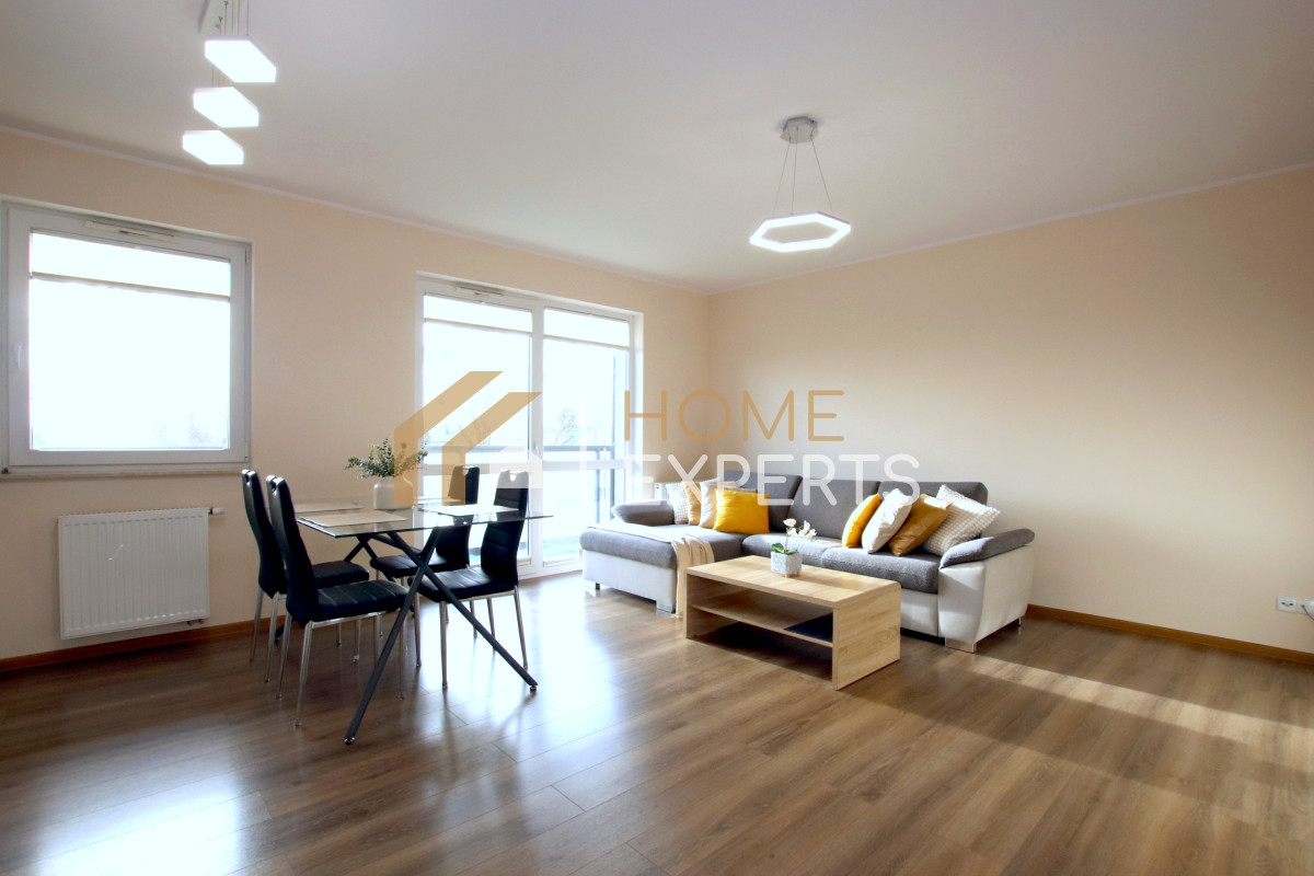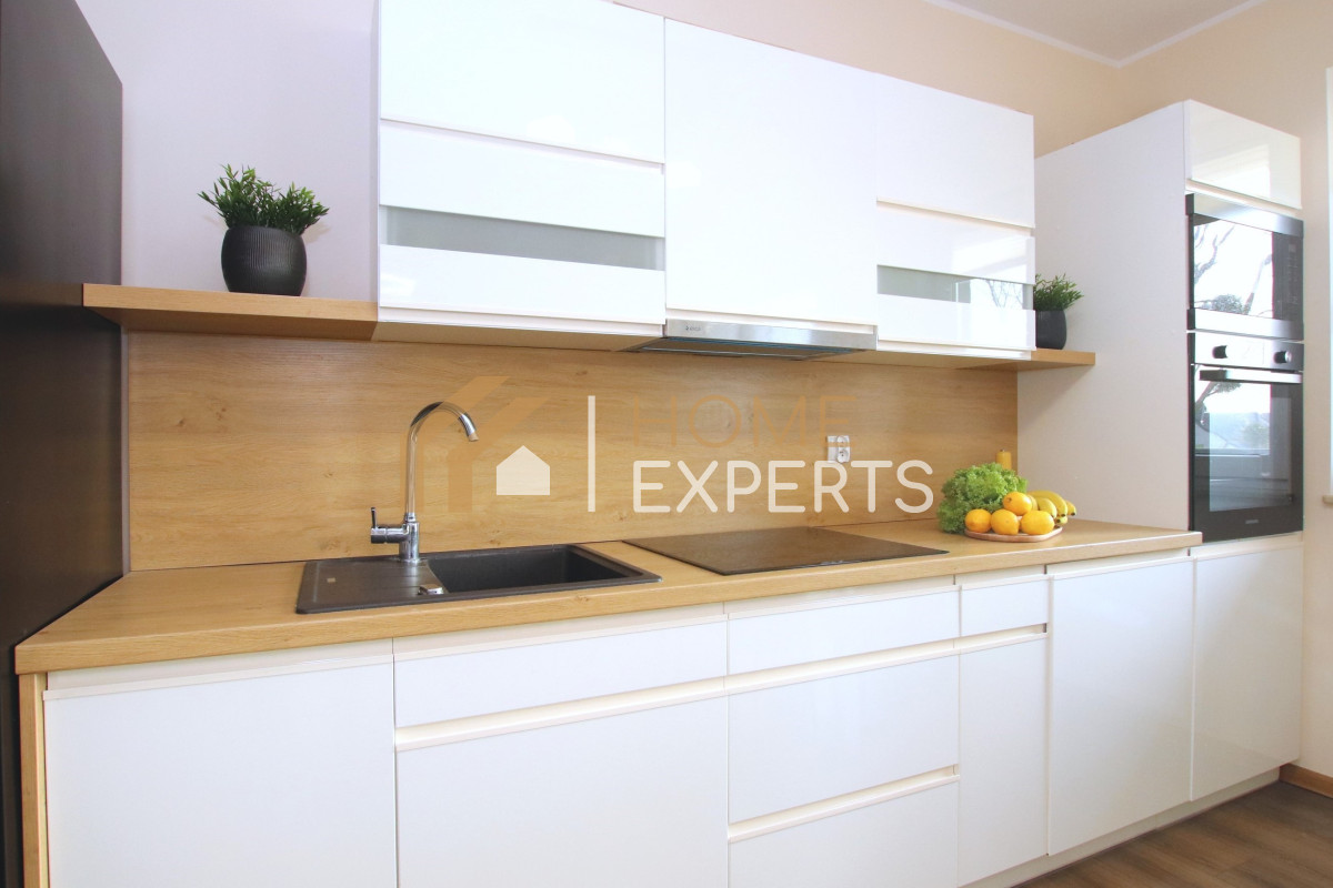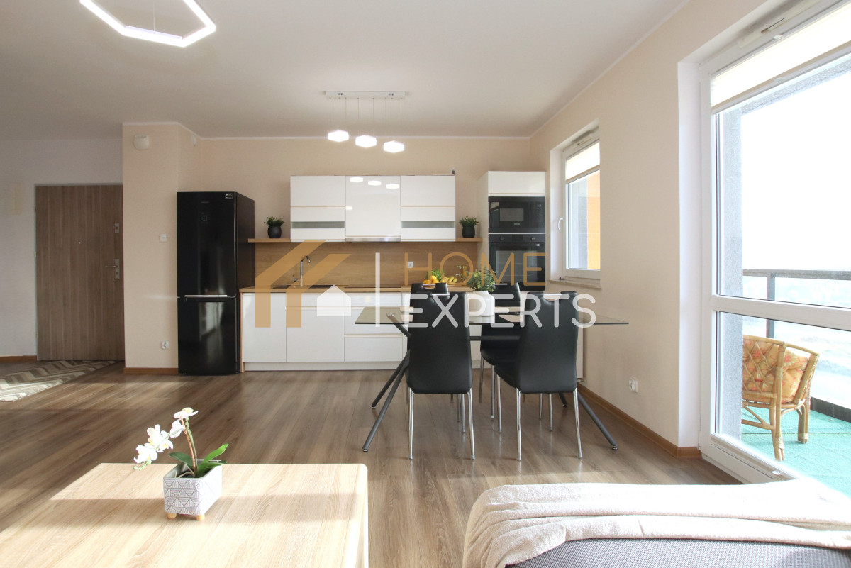Salon z aneksem kuchennym i z wyjściem na duży balkon z widokiem na zieleń i otwartą przestrzeń. W cenie mieszkania jest zabudowa kuchenna wyposażona w sprzęty AGD (płyta indukcyjna Bosch, piekarnik Samsung, zmywarka Bosch, wbudowana kuchenka mikrofalowa Samsung oraz lodówka Samsung). W cenie mieszkania jest również szafa w zabudowie w przedpokoju.