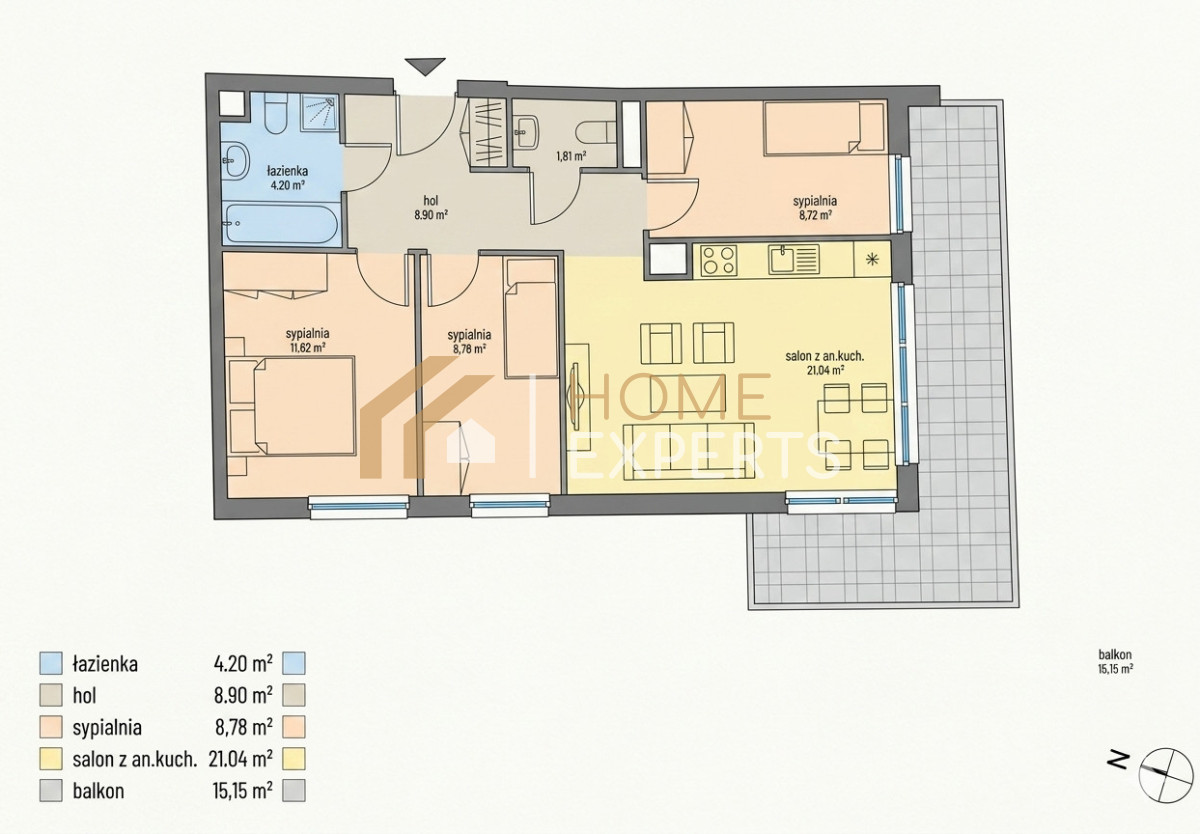 - trzech sypialni (11,62m2, 8,72m2 oraz 8,78m2)