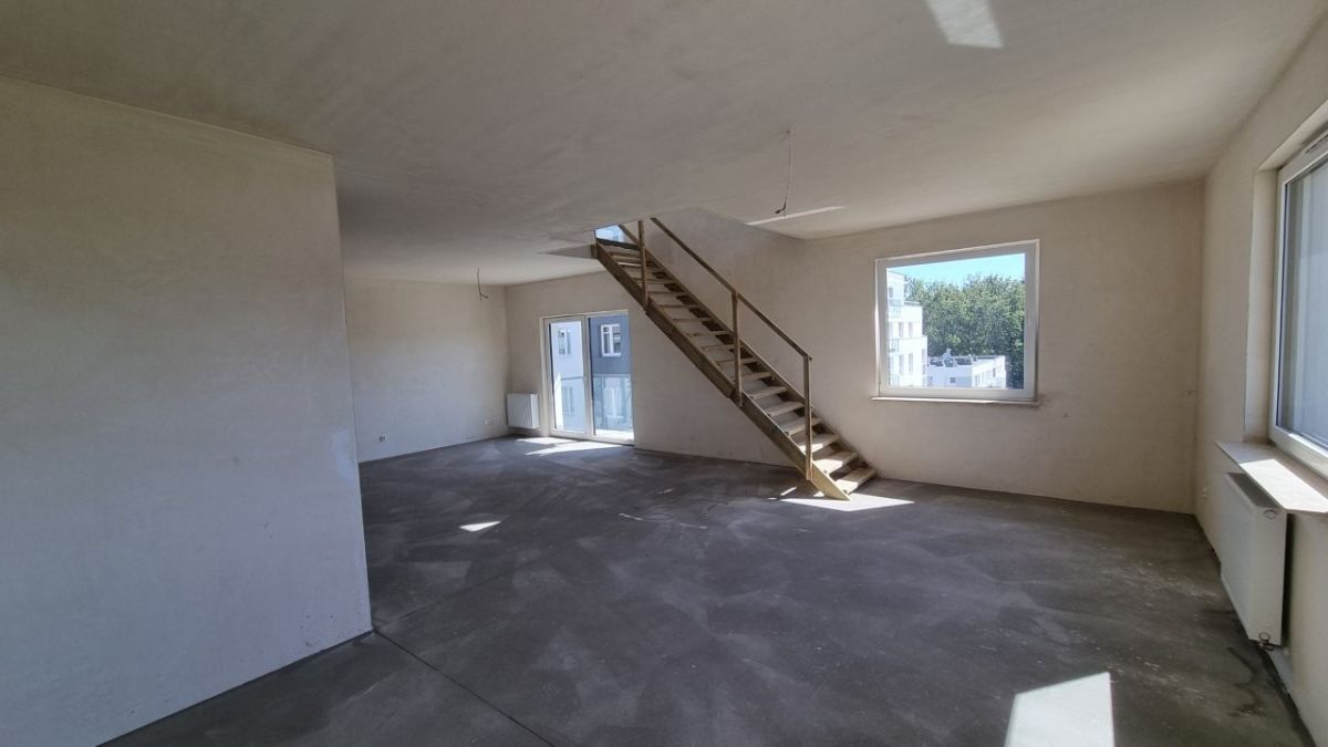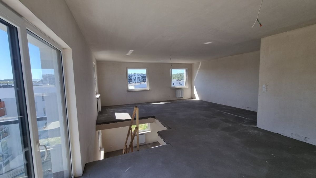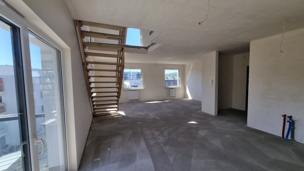 Przestronne mieszkanie w stanie deweloperskim wyróżnia się dużym salonem z aneksem kuchennym oraz miejscem na gabinet na I poziomie oraz 2ma lub 3ma sypialniami na piętrze bez skosów.