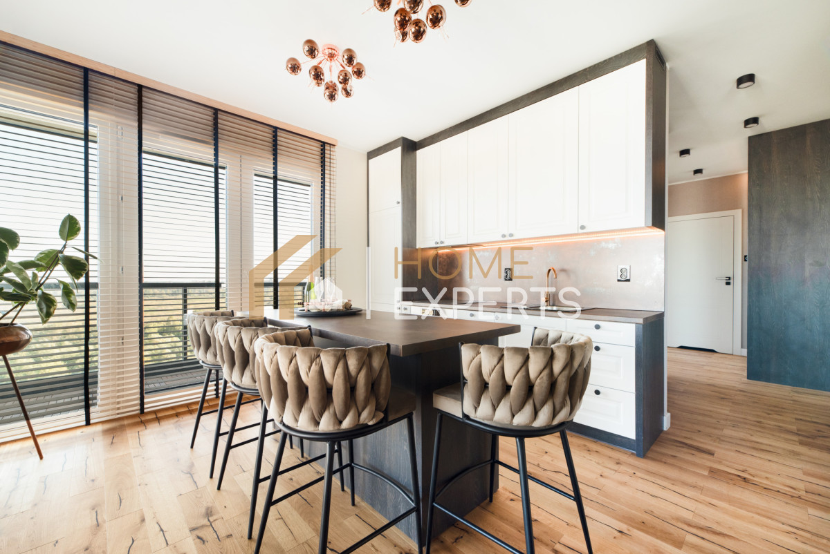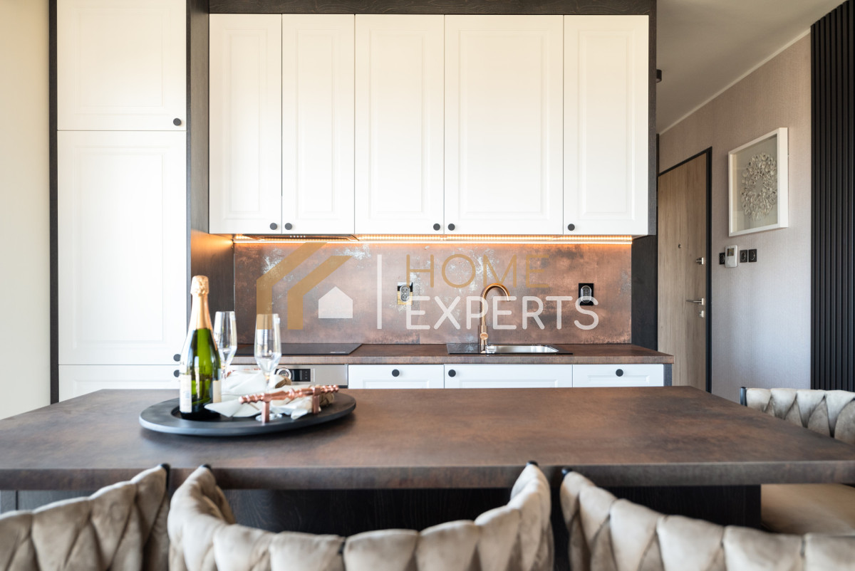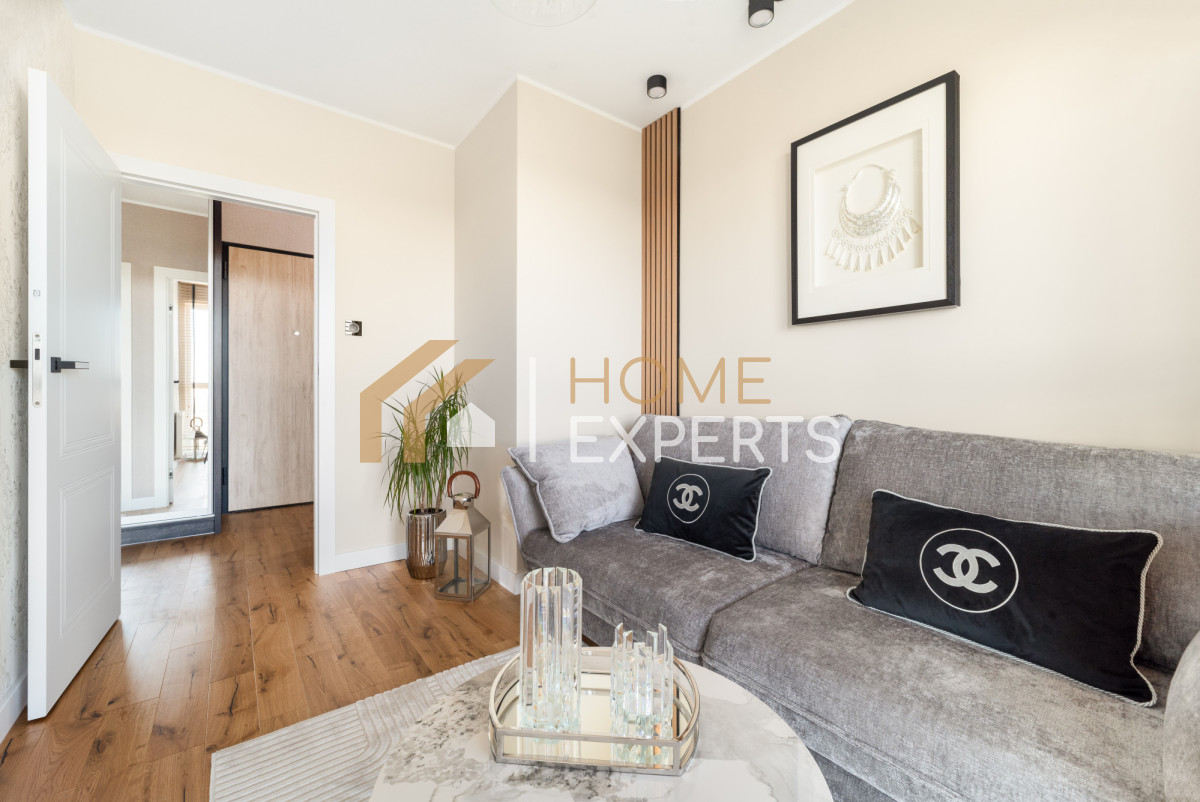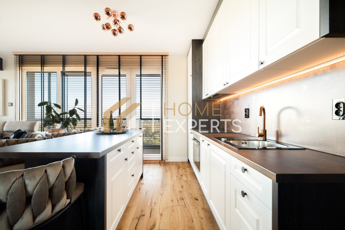 Wnętrza są urządzone w eleganckim, neutralnym stylu i w pełni wyposażone w wysokiej jakości sprzęt AGD w kuchni i łazience. Stan nieruchomości jest idealny - mieszkanie nigdy wcześniej nie było zamieszkałe.