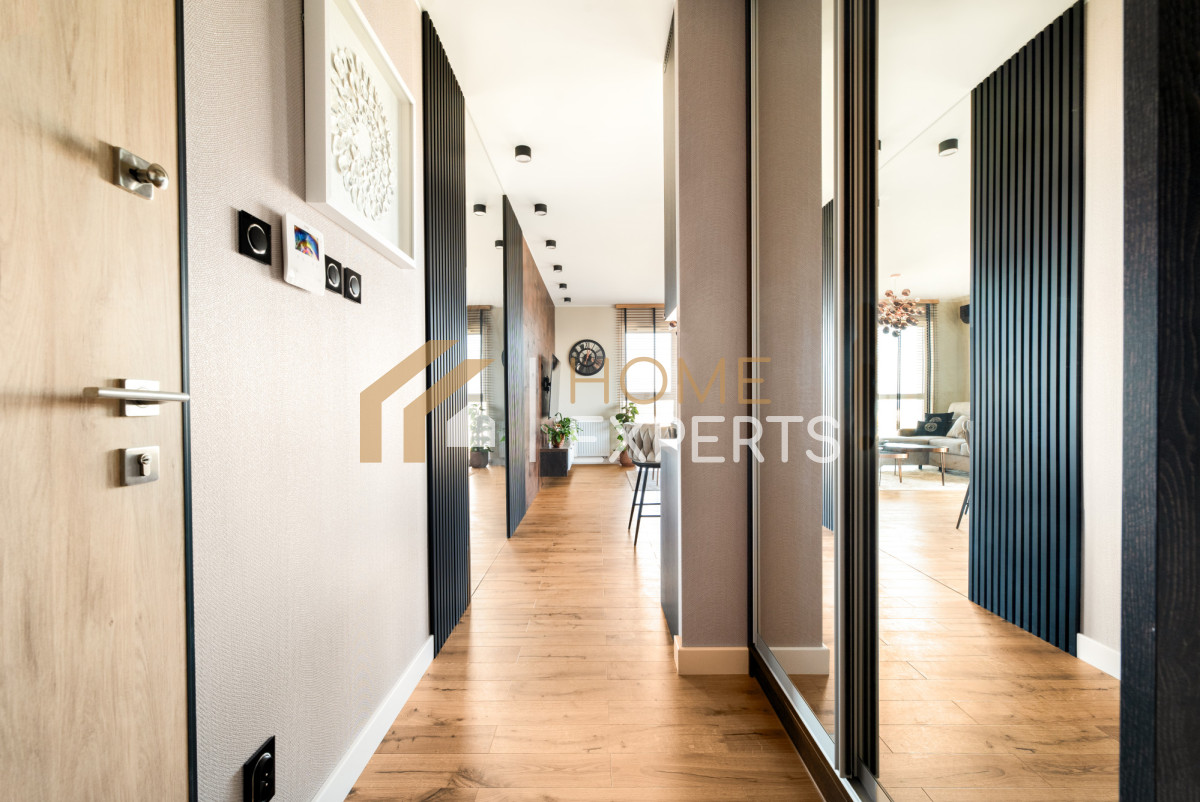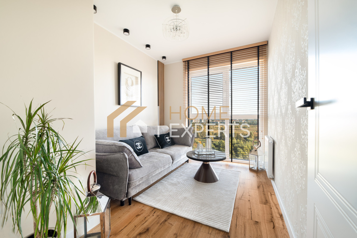 Mieszkanie znajduje się na 11. piętrze nowoczesnego budynku z 2024 roku, wyposażonego w cichobieżne windy i przemyślaną infrastrukturę. Przestronne wnętrze o wysokim standardzie wykończenia obejmuje: