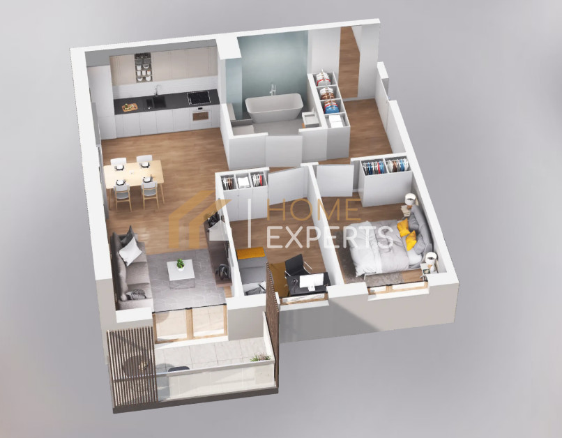 - przestronny salon z aneksem kuchennym,