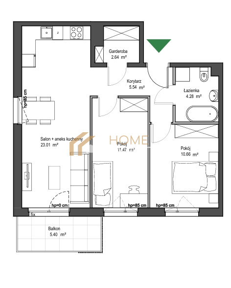 Sercem mieszkania jest dwustronny salon z aneksem kuchennym (23,01m2), do którego przynależy balkon (5,40m2) o południowo-wschodniej orientacji. Na tę samą stronę świata wychodzą okna dwóch sypialni (11,47m2 i 10,66m2). W mieszkaniu znajduje się także garderoba (2,64m2), łazienka (4,28m2) i korytarz. Lokal jest ciepły i słoneczny.