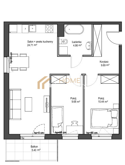 Sercem mieszkania jest salon z aneksem kuchennym (24,71m2), w którym każdy poranek będzie słoneczny i przyjemny. Mieszkanie posiada również dwie sypialnie (9,68m2 i 10,44m2), łazienkę (4,86m2) i korytarz z miejscem na dużą szafę. Lokal jest dwustronny, ciepły i jasny.