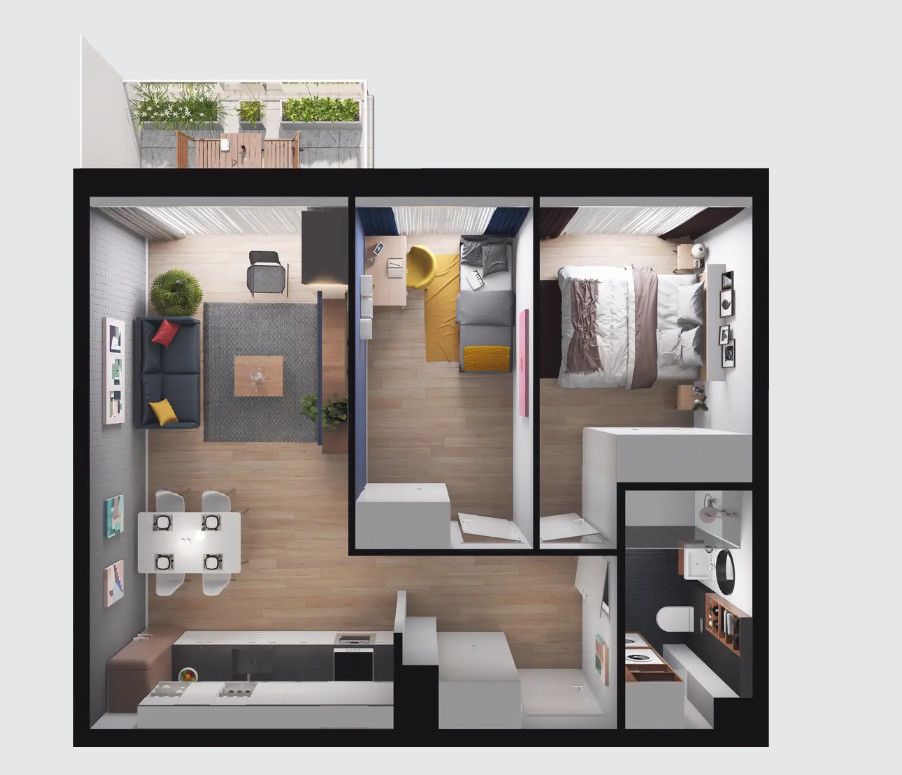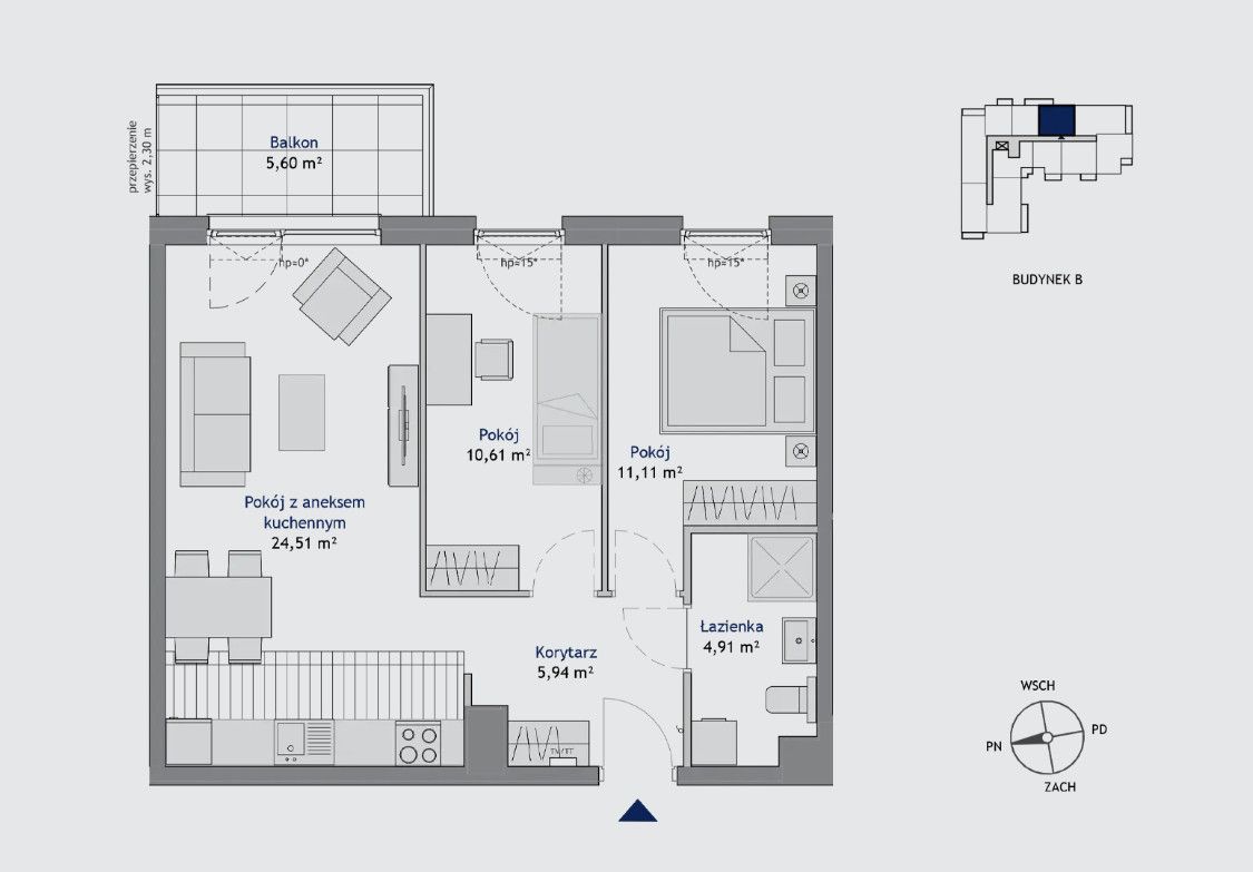 Dwie sypialnie (10,61 m² i 11,11 m²) umożliwiają dowolne dopasowanie do potrzeb — mogą pełnić funkcję sypialni, gabinetu czy pokoju dziecięcego. Łazienka (4,91 m²) została zaprojektowana z myślą o funkcjonalności i wygodzie. Przedpokój z miejscem na zabudowaną szafę ułatwia przechowywanie i organizację przestrzeni. To mieszkanie idealnie łączy nowoczesny charakter z praktycznymi rozwiązaniami.
