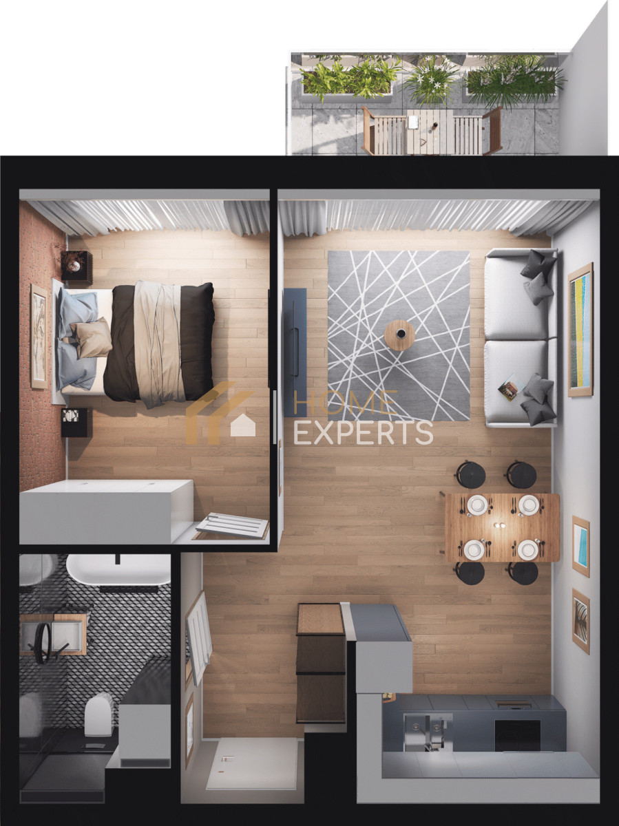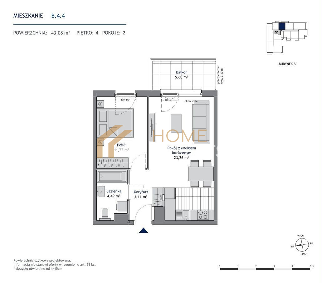 Dwupokojowe mieszkanie o powierzchni 42,91 m², położone na czwartym piętrze nowoczesnego budynku, to propozycja dla osób ceniących funkcjonalność i komfort. Wschodnia ekspozycja zapewnia naturalne światło o poranku, sprzyjając dobremu samopoczuciu. Salon z aneksem kuchennym (23,26 m²) tworzy przyjemną przestrzeń do wspólnych posiłków, relaksu i spotkań. Duże okna oraz wyjście na balkon sprawiają, że wnętrze jest jasne i przewiewne, a balkon staje się miejscem na chwilę wytchnienia.