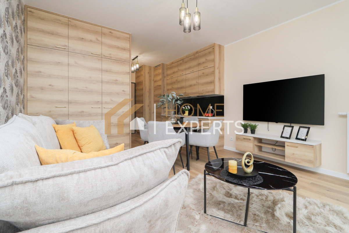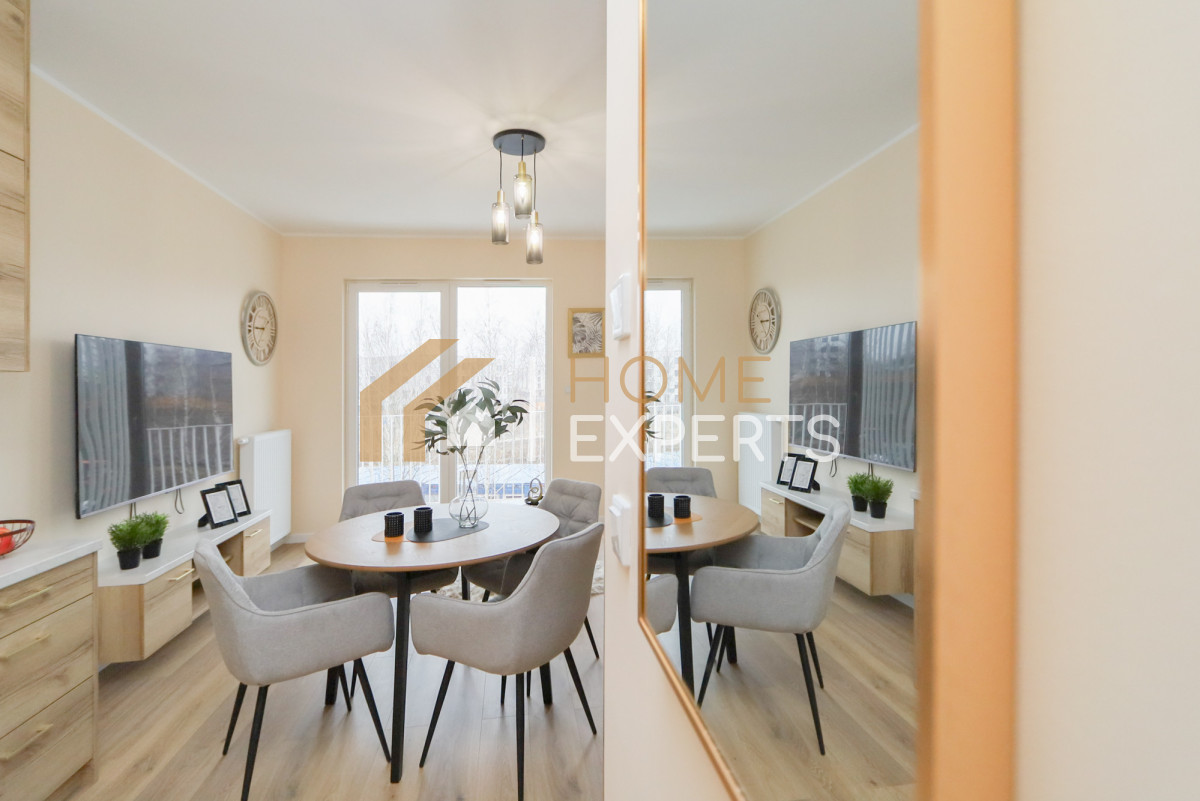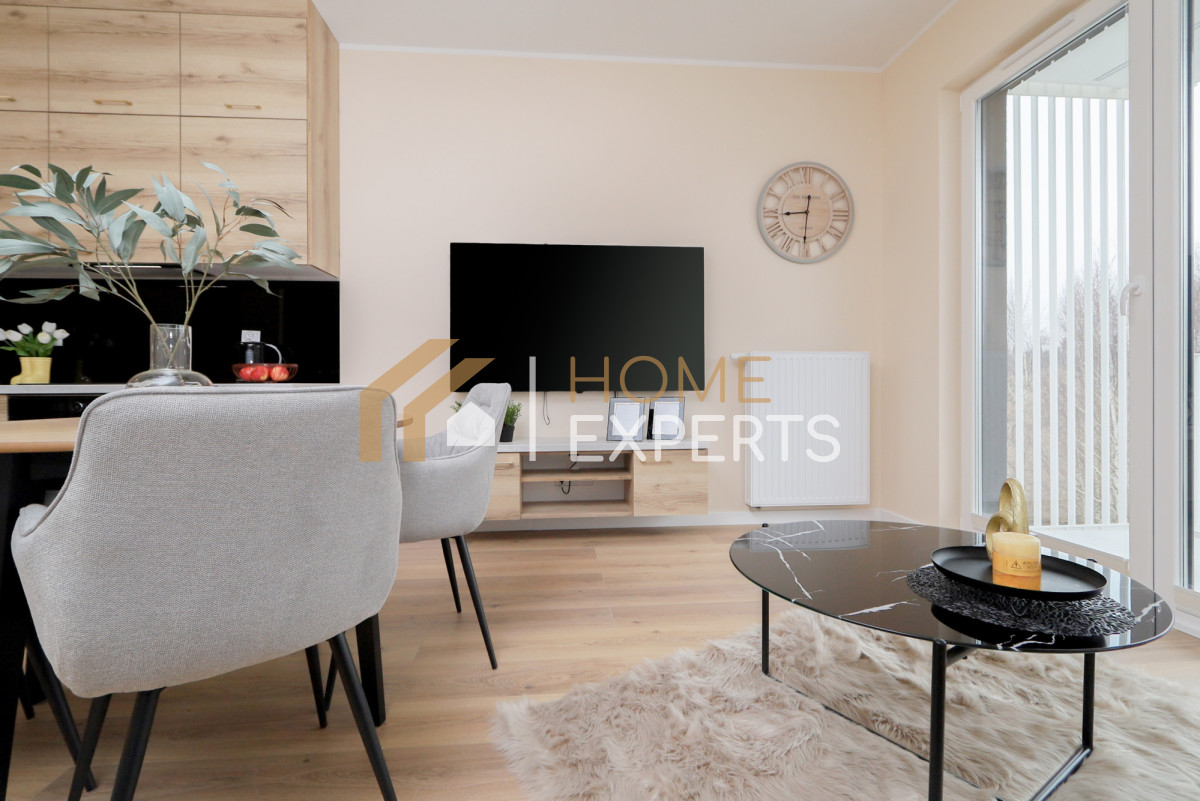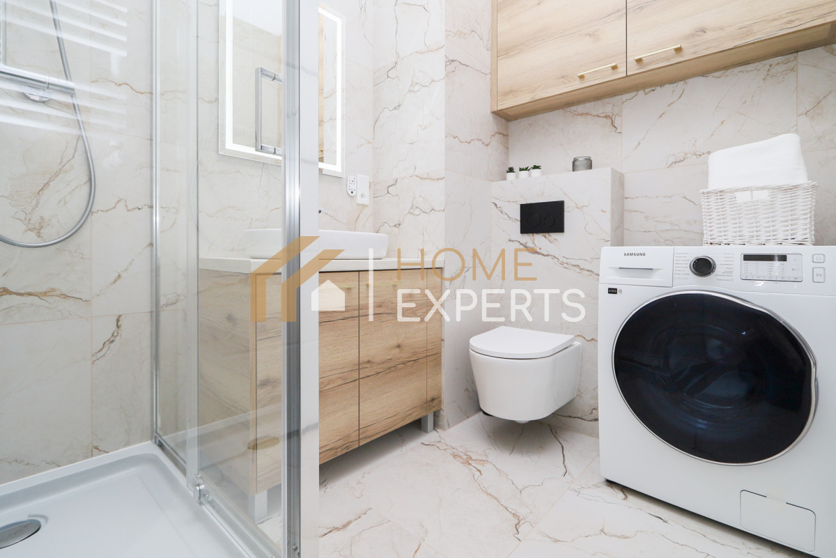 Mieszkanie zostało urządzone z dbałością o detale - w pełni wyposażona kuchnia (sprzęt AGD), meble, telewizor, pralko-suszarka, gotowa łazienka. Wnętrze jest jasne, funkcjonalne i gotowe do natychmiastowego zamieszkania lub wynajmu - bez dodatkowych kosztów.