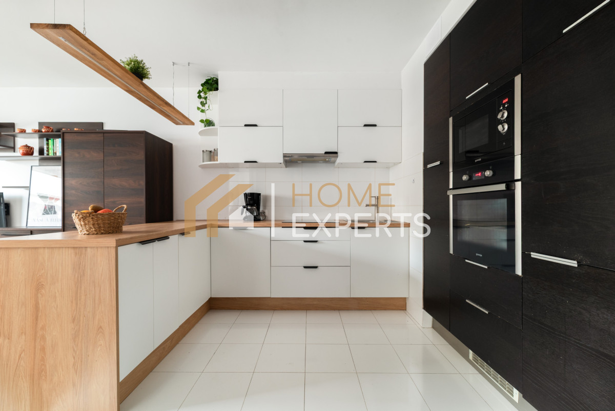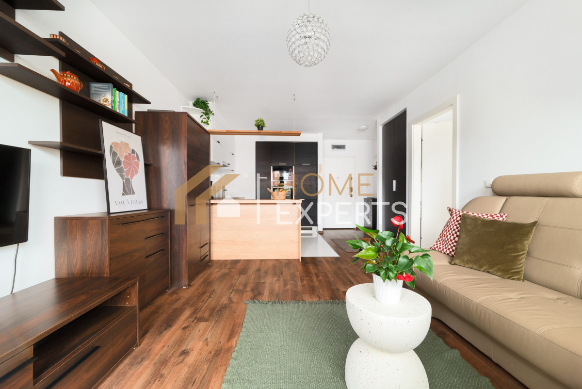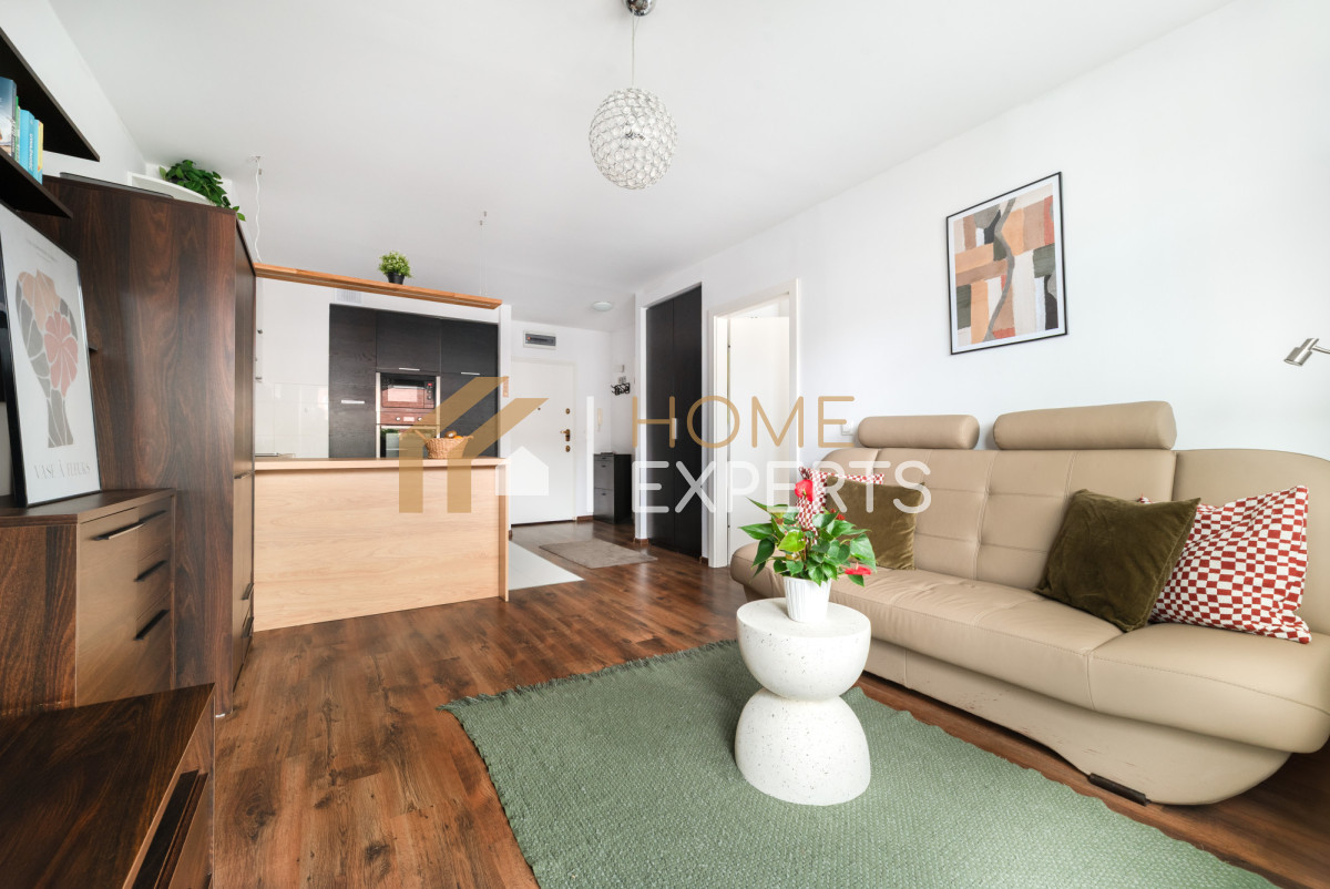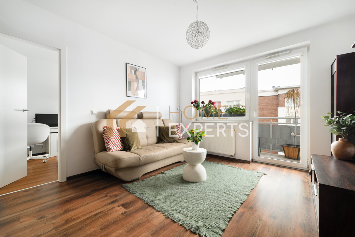 • Salon z przestronnym aneksem kuchennym po częściowym remoncie, z wyjściem na balkon