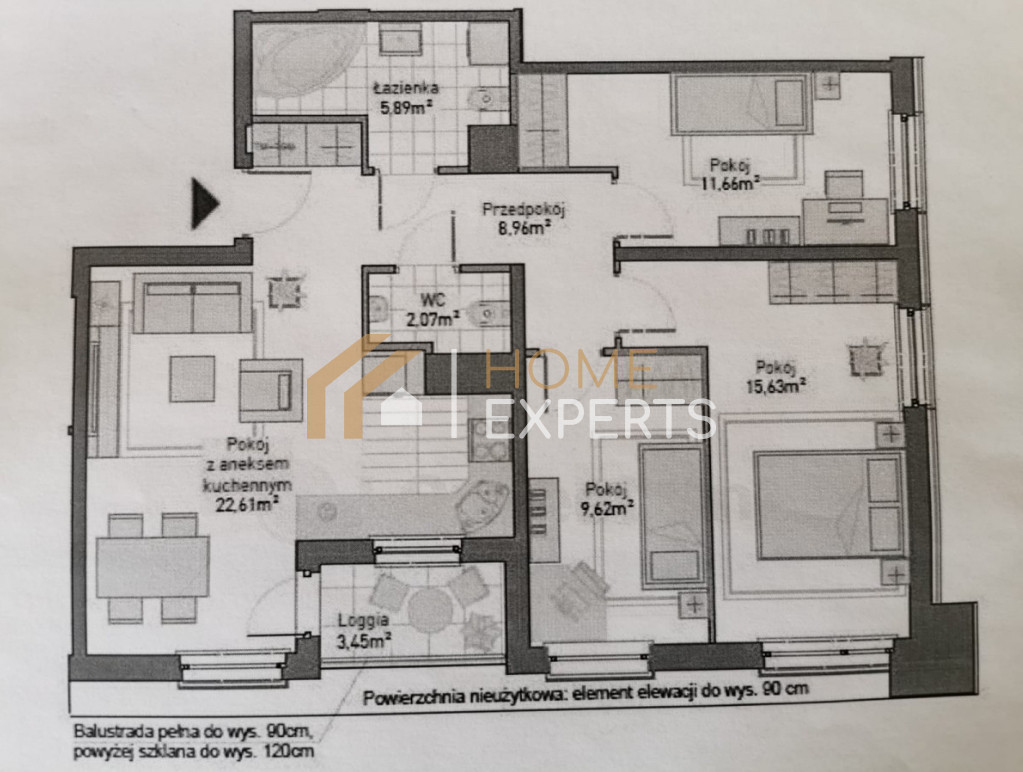 - trzy sypialnie, salon z jadalnią, łazienka, toaleta i kuchnia