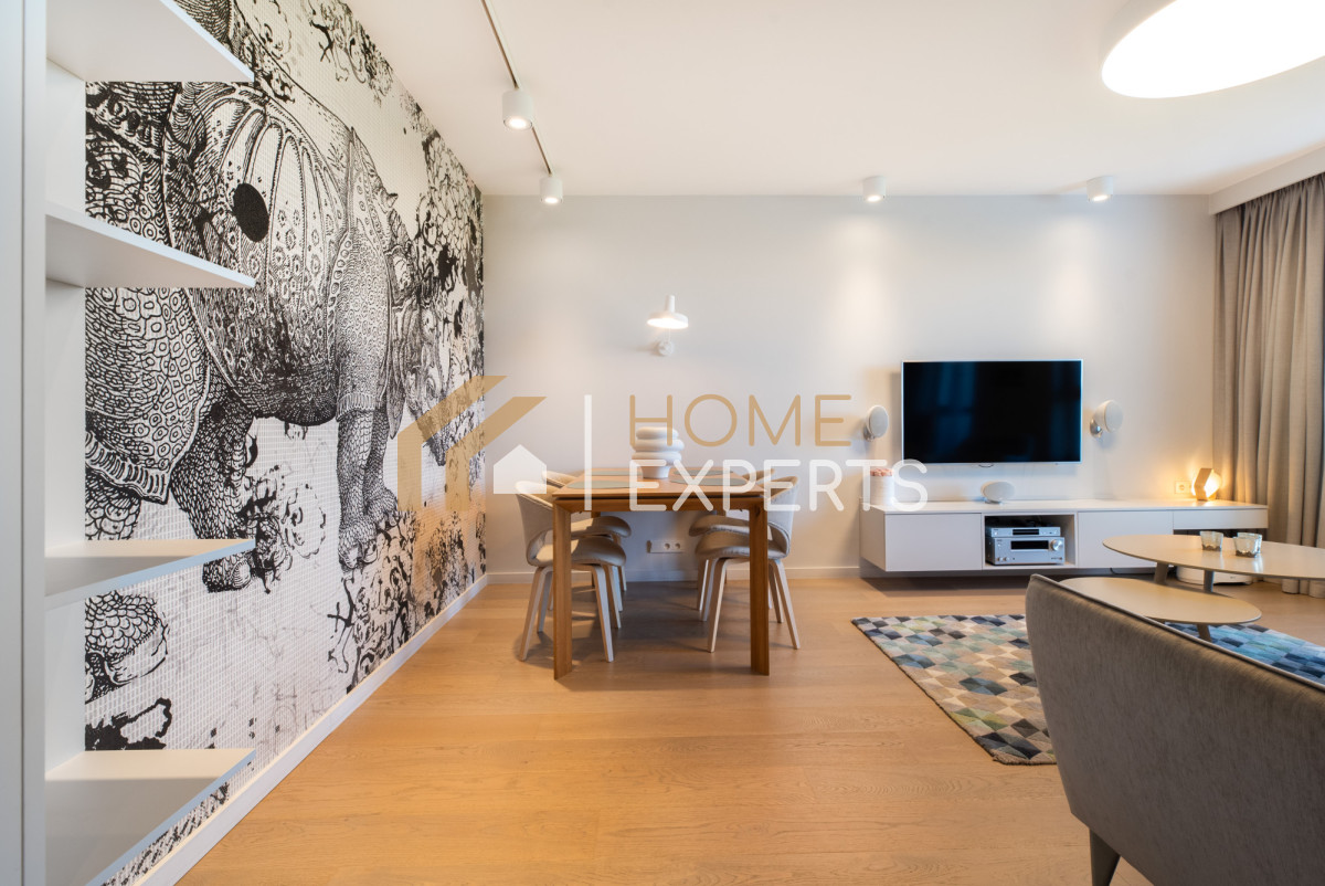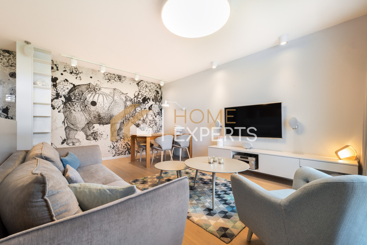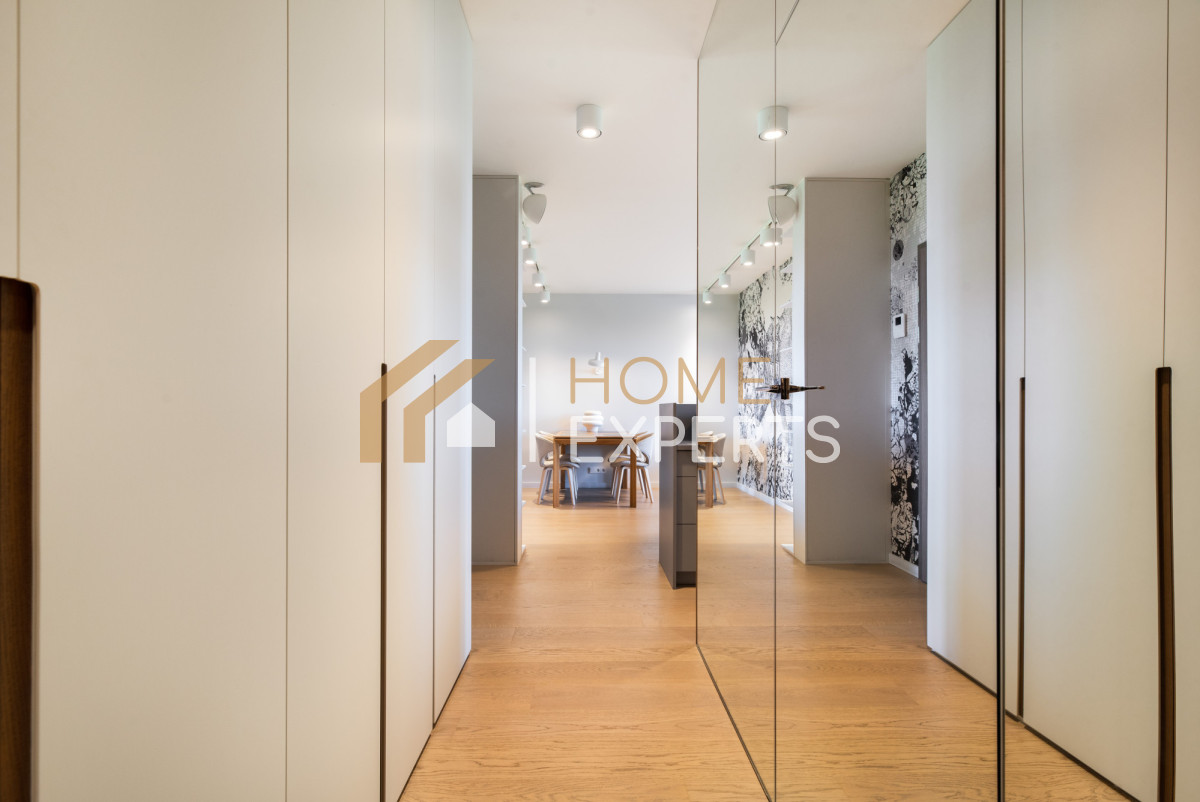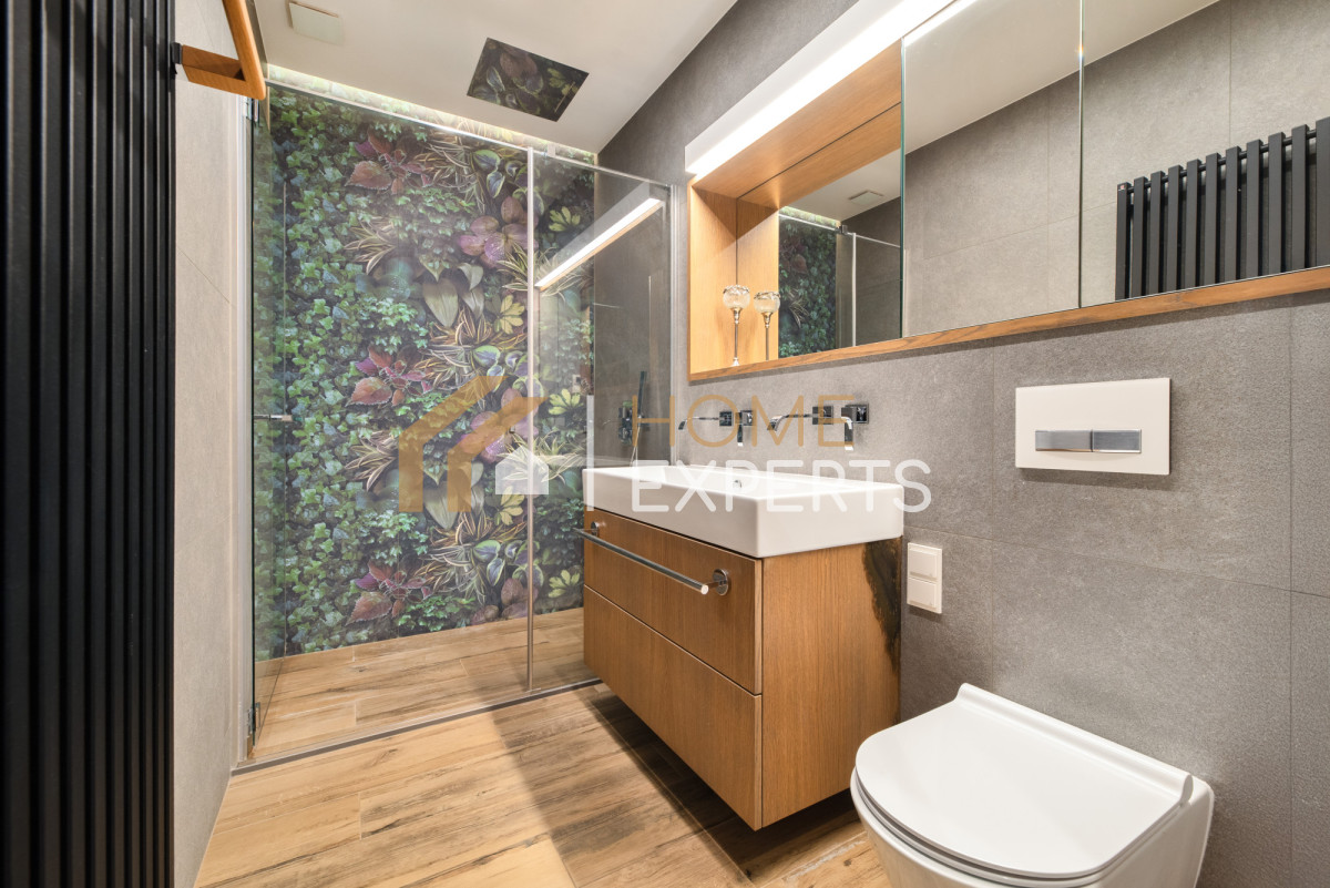 Wykończenie wykonano w wysokim standardzie - zastosowano wysokiej jakości podłogi i zabudowy stałe, zaprojektowano przemyślane oświetlenie, a dodatkowym udogodnieniem są elektrycznie sterowane zasłony. Całość tworzy harmonijną i komfortową przestrzeń do życia.