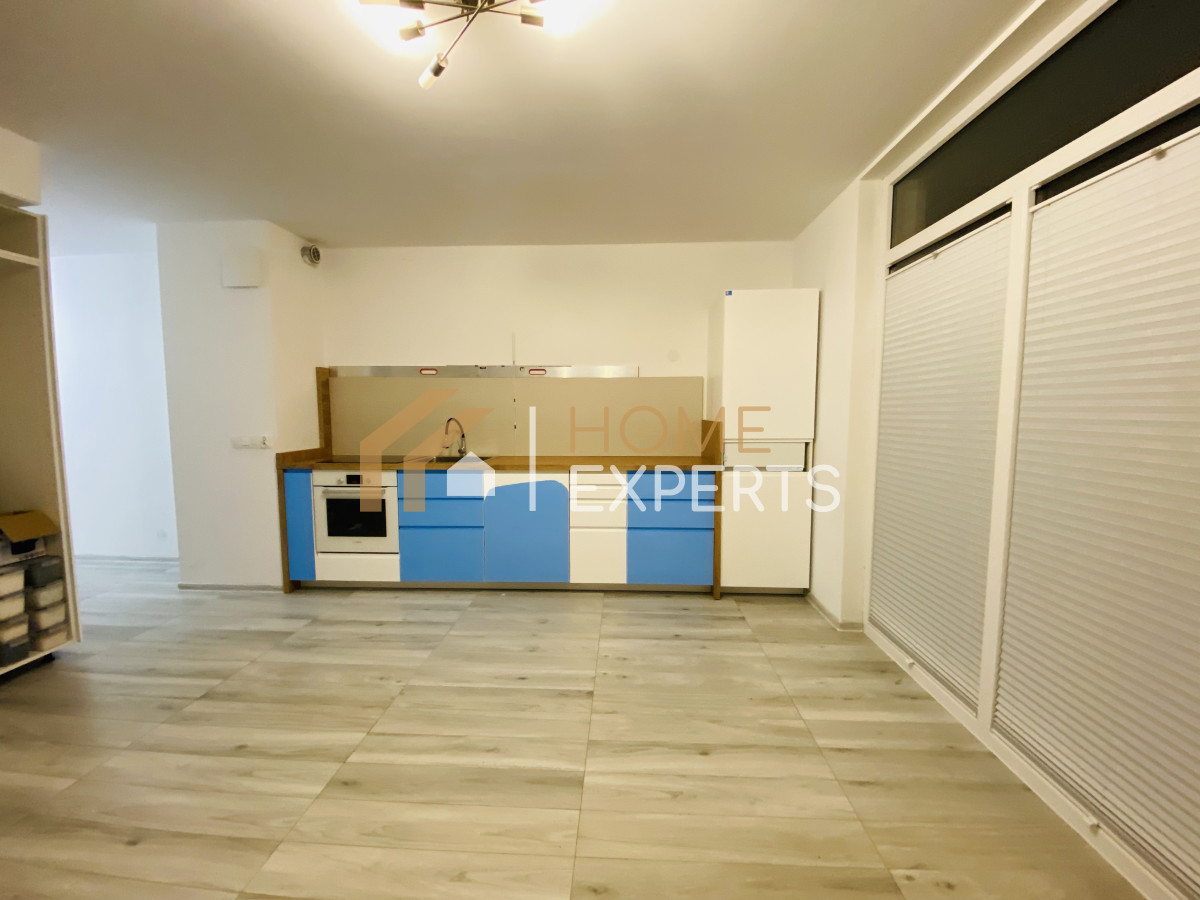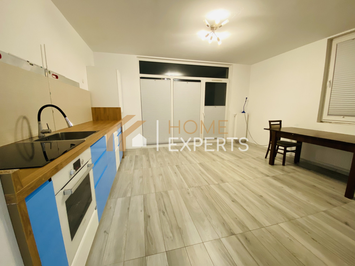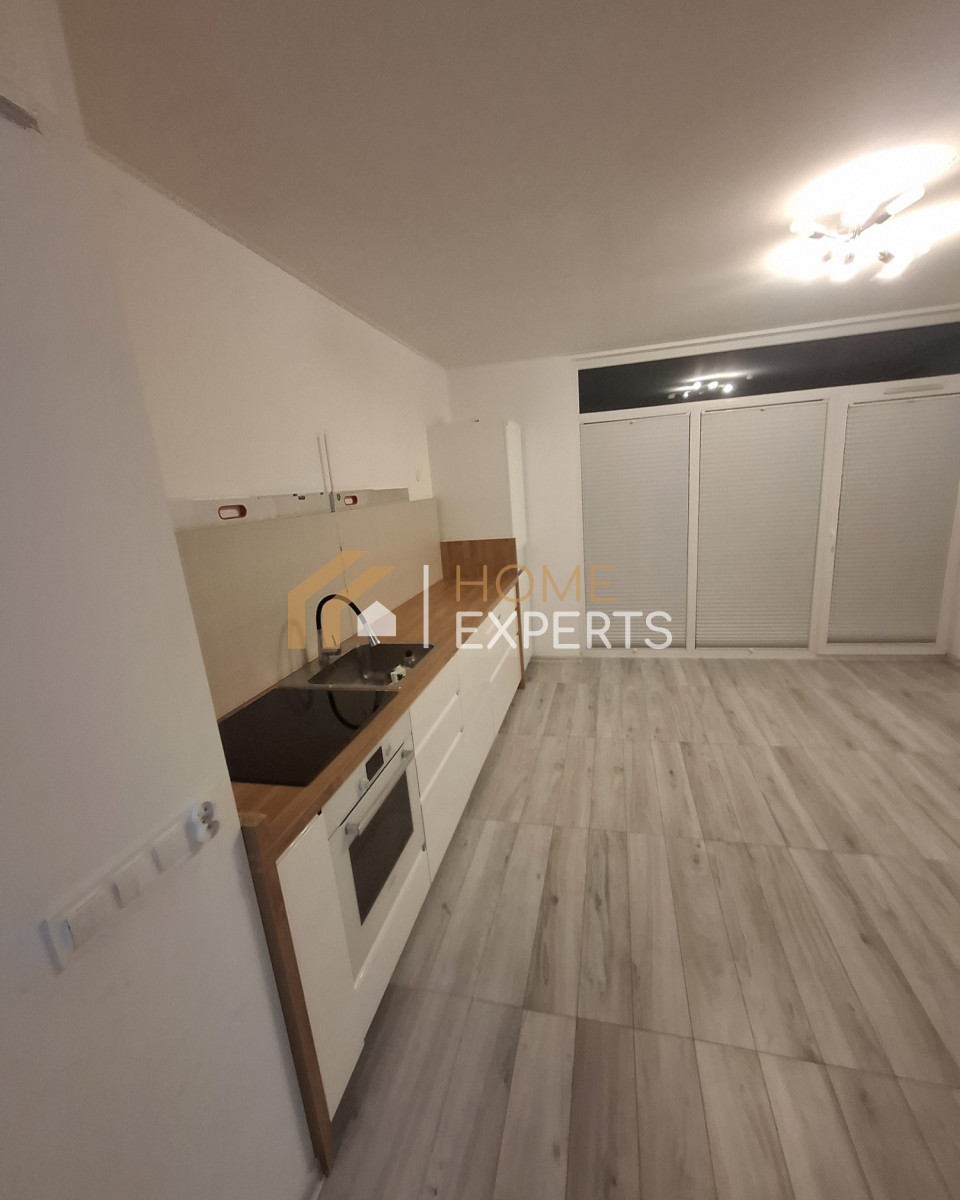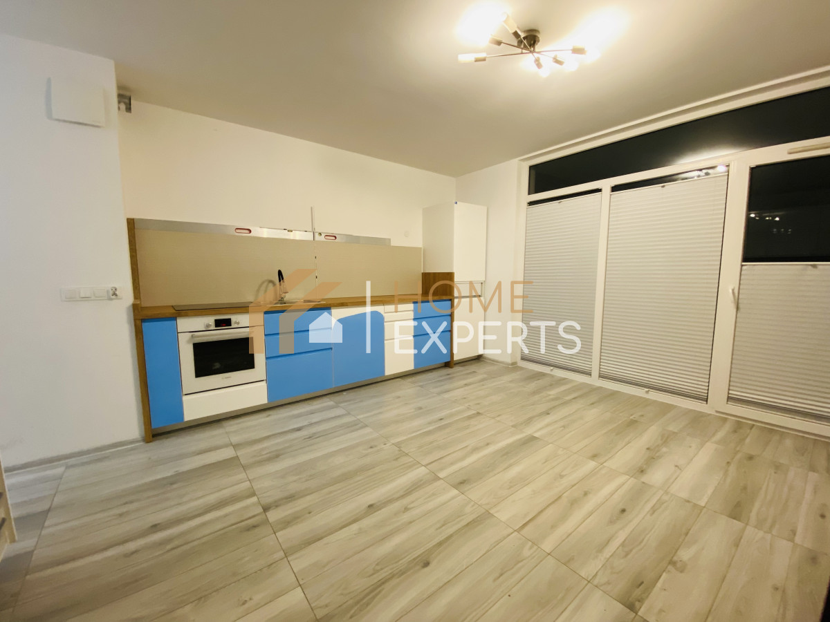Kuchnia jest częściowo umeblowana i wyposażona w niezbędny sprzęt AGD (lodówka, piekarnik, płyta indukcyjna). Na meblach i sprzęcie kuchennym jest jeszcze przyklejona folia fabryczna.