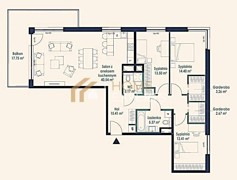 - Metraż: Salon z aneksem kuchennym 40.54 m²