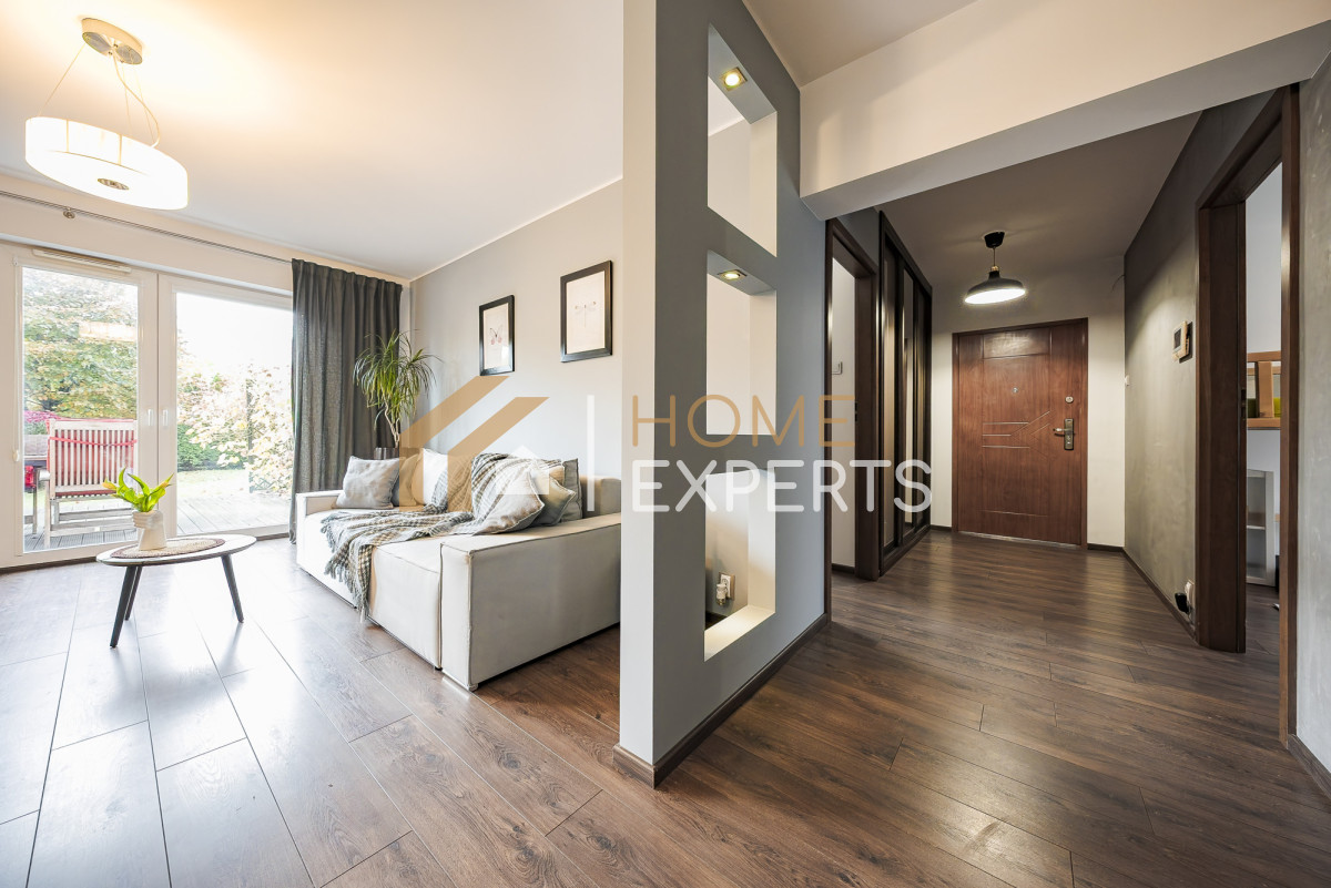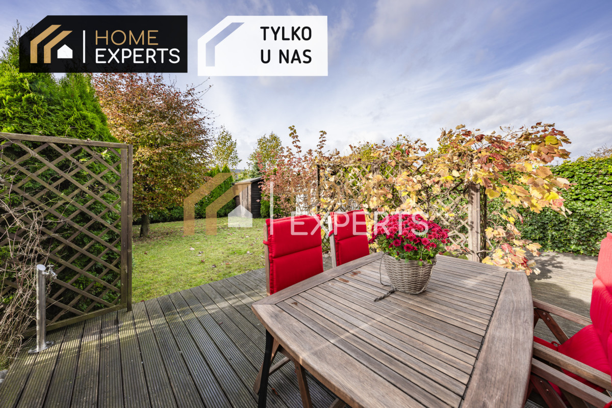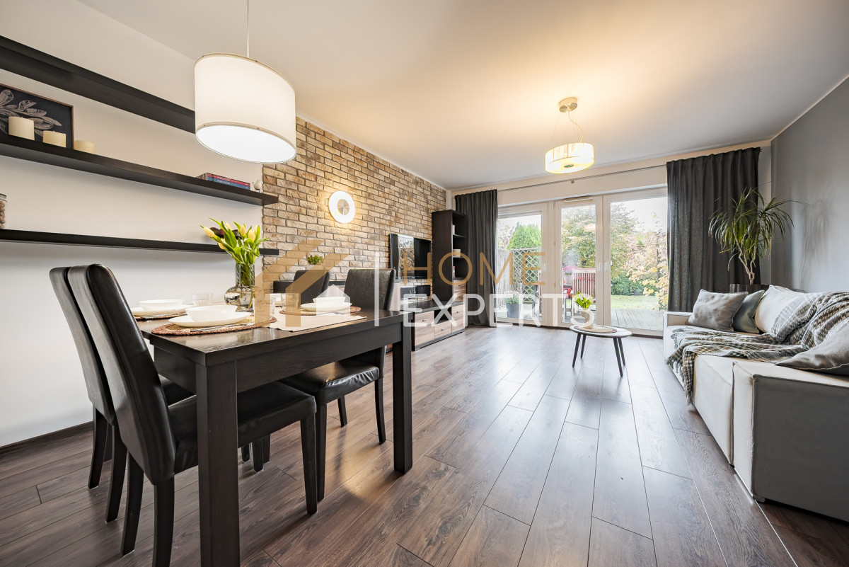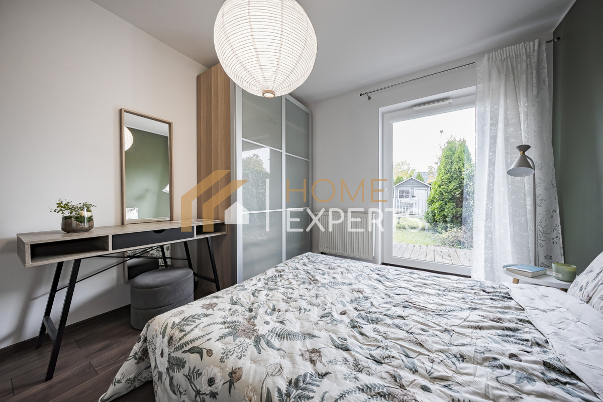Z salonu i sypialni - usytuowanych od zachodniej strony - można wyjść na przestronny, drewniany taras oraz zagospodarowany ogród o powierzchni ok. 100 m2. Jest to zaciszna enklawa osłonięta wysoką zielenią, która stwarza poczucie prywatności w środku miasta.