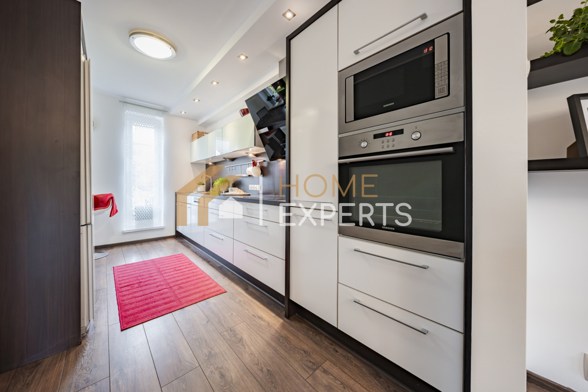Mniejsza sypialnia, kuchnia i łazienka posiadają okna od strony wschodniej, po której znajduje się również prywatne, ogrodzone miejsce parkingowe oraz niewielki zielony ogródek