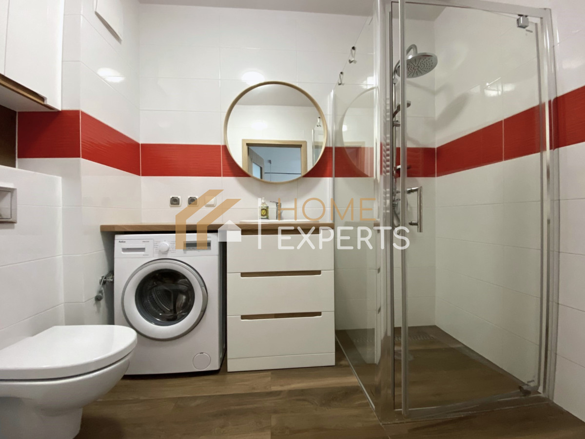 łazienka: zabudowy, prysznic, pralka,