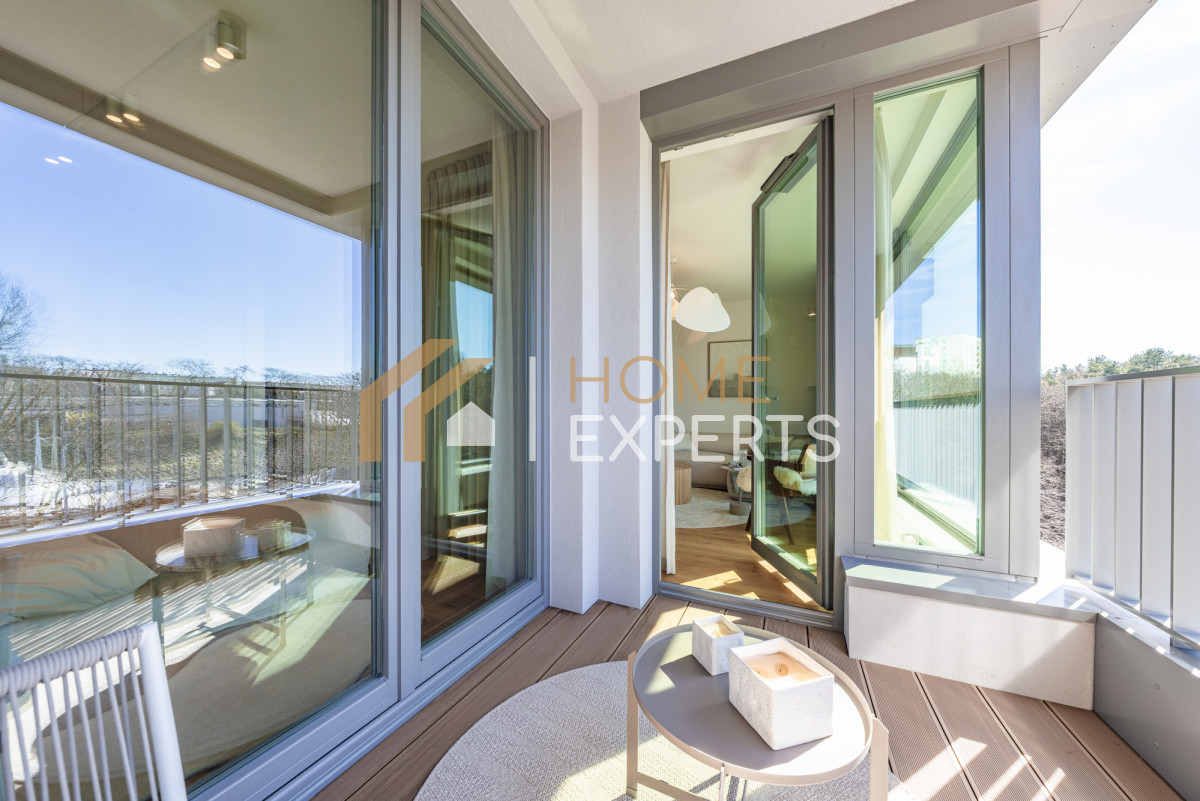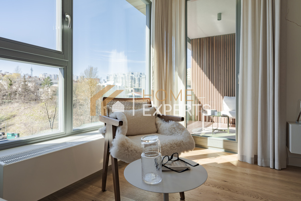 Z salonu wyjście na duży balkon, gdzie jest fotel oraz stolik.