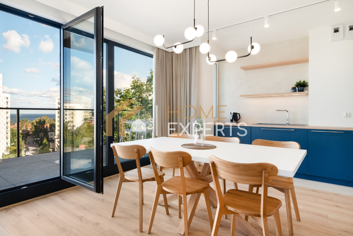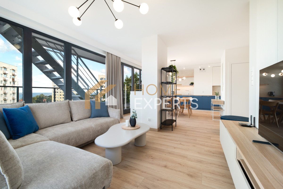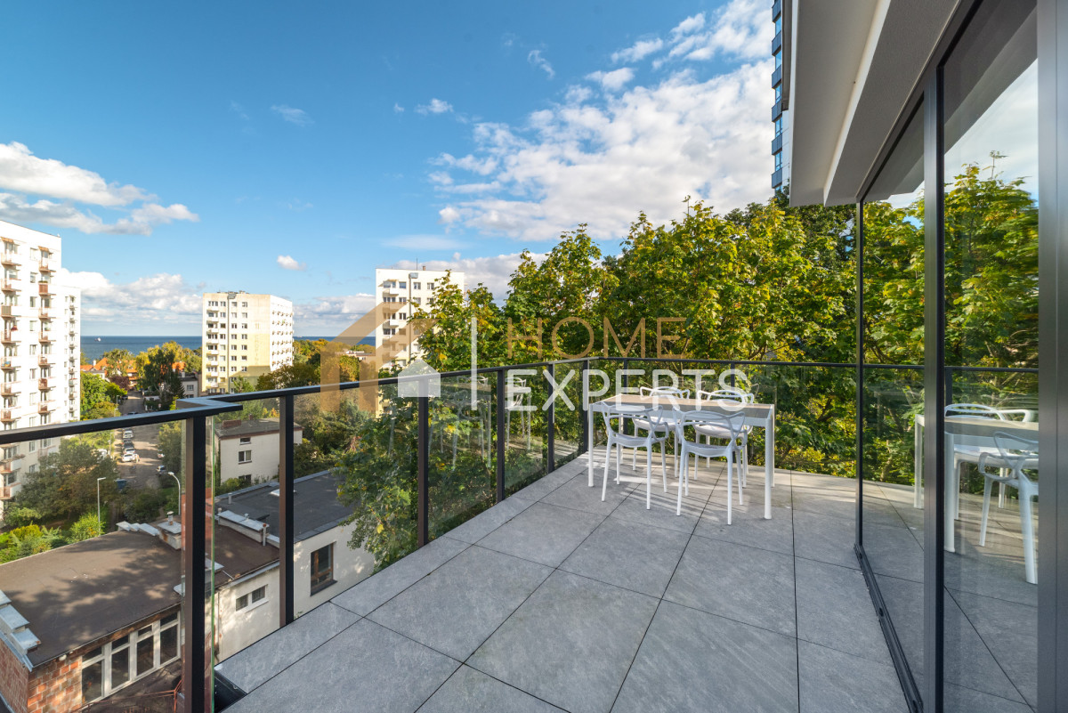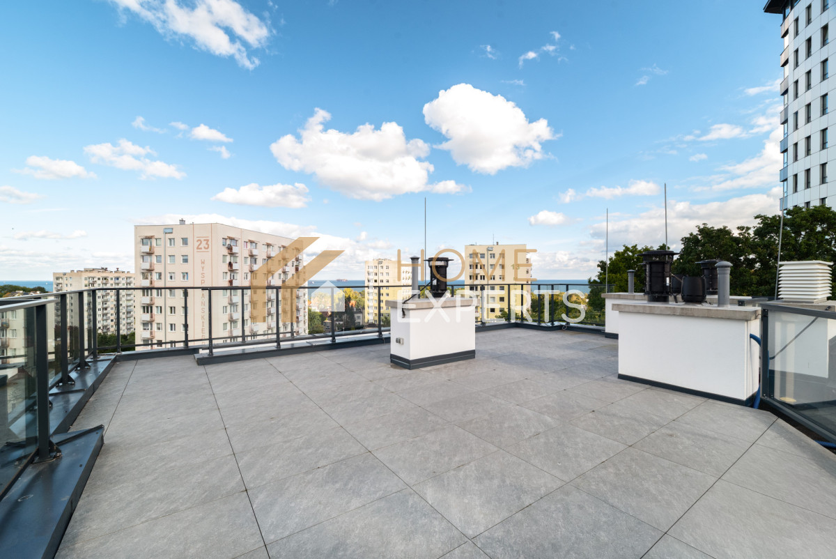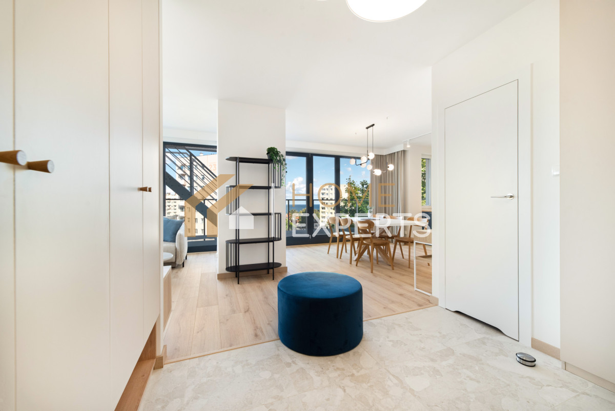 Prezentujemy świeżo wykończone, ekskluzywne 3-pokojowe mieszkanie z 2 dużymi tarasami, loggią i widokiem na morze, jedyne 500 metrów od morza, w Gdyni przy ul. Cypriana Norwida 9 (Wzgórze Świętego Maksymiliana).