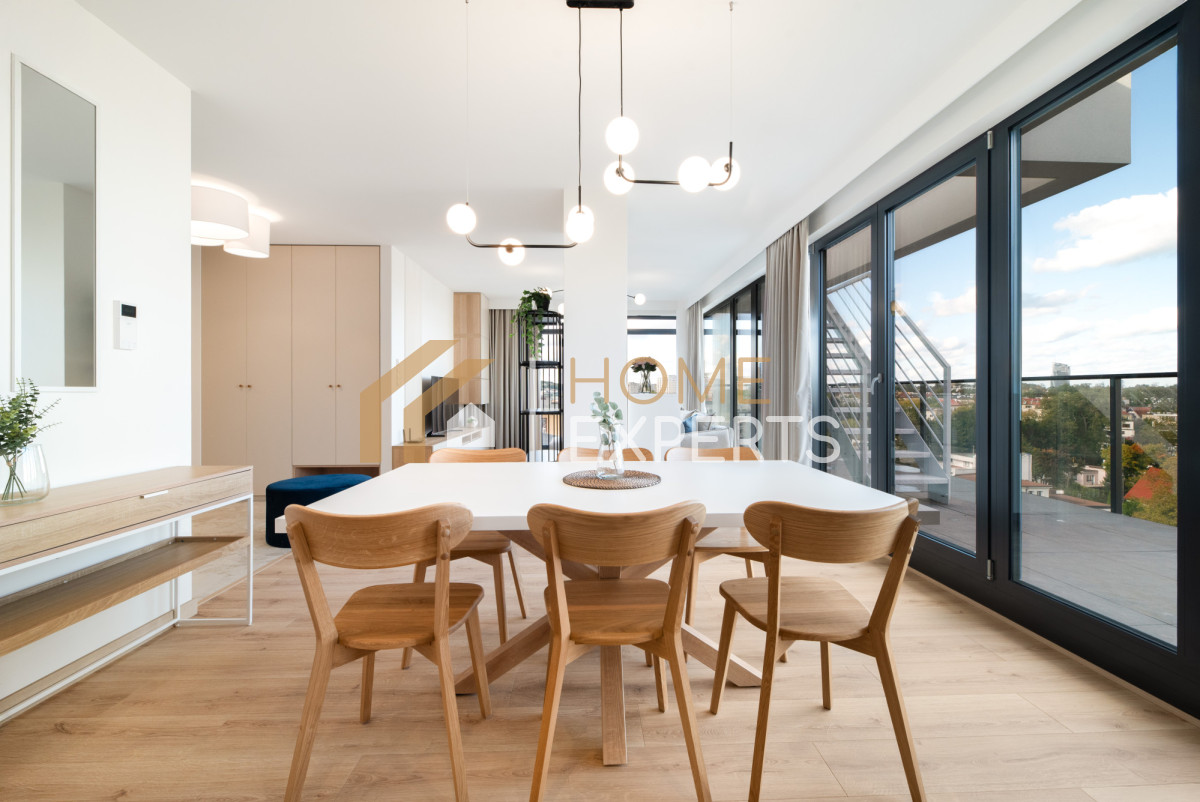 - Przestronny salon z kanapą narożną i stołem jadalnianym. Z salonu wyjście na dwa duże tarasy (jeden na poziomie mieszkania, drugi na dachu - oba na wyłączny użytek),