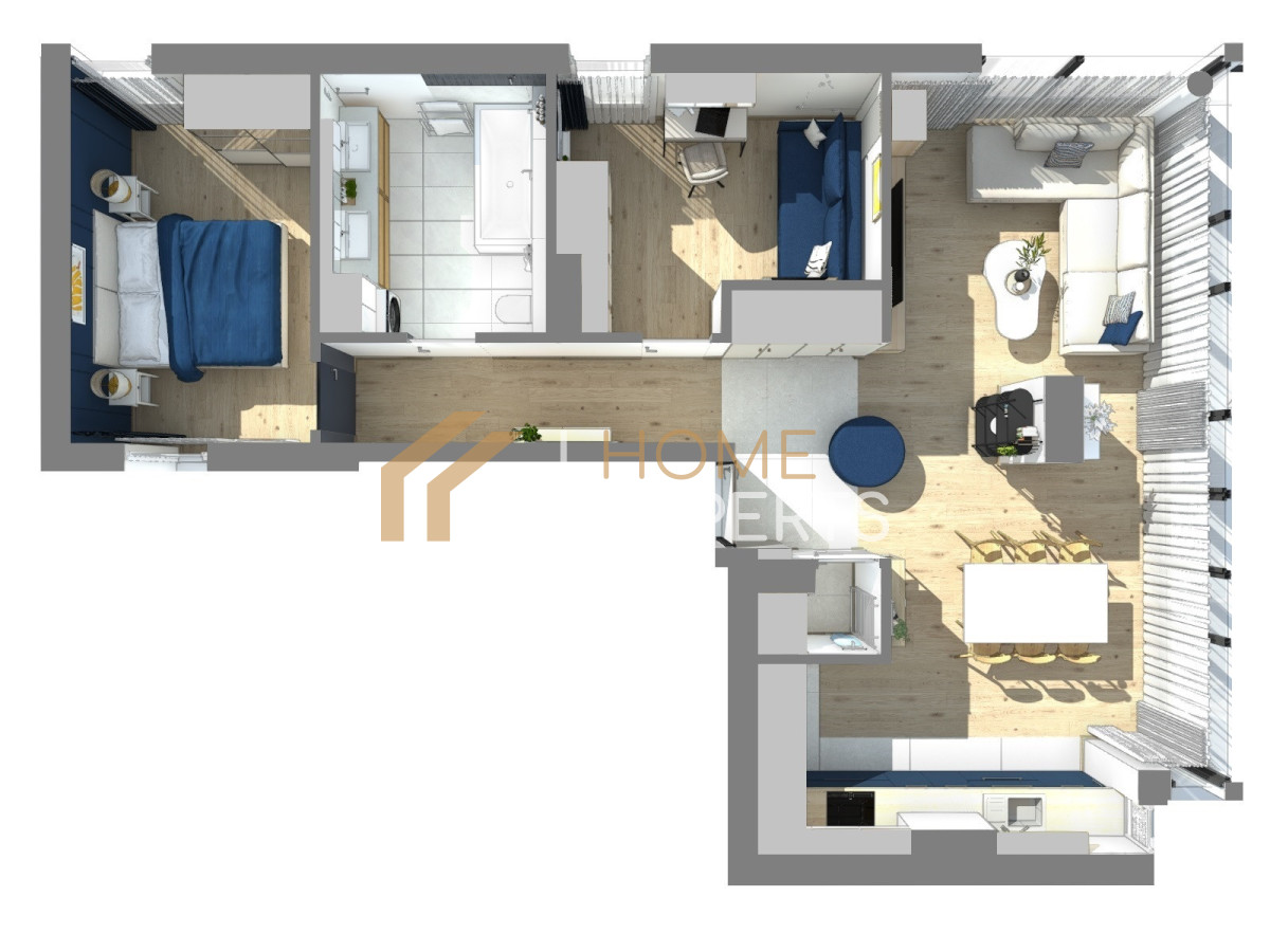 - Sypialnia druga z sofą rozkładaną, biurkiem i szafą ubraniową. Z obu sypialni wyjście na balkon 8,5 m2,