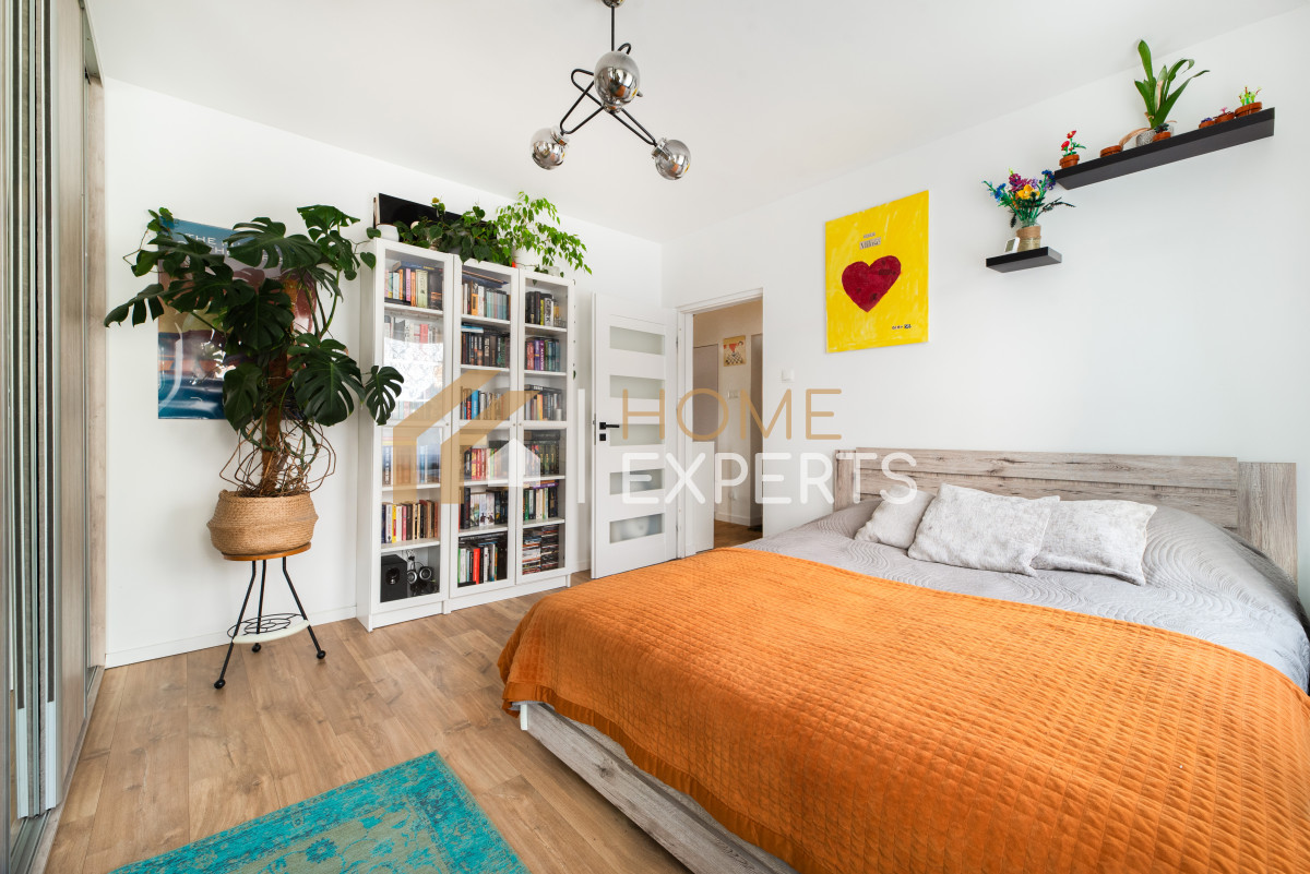 * 2 niezależne pokoje (duża sypialnia i nieduży pokój - w tej chwili pełniący rolę dziecięcego), mały salon z aneksem kuchennym, łazienka oraz przedpokój o łącznej powierzchni 45,5 m2