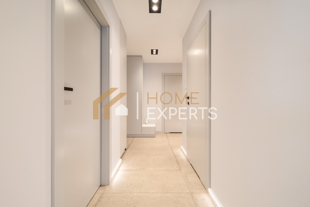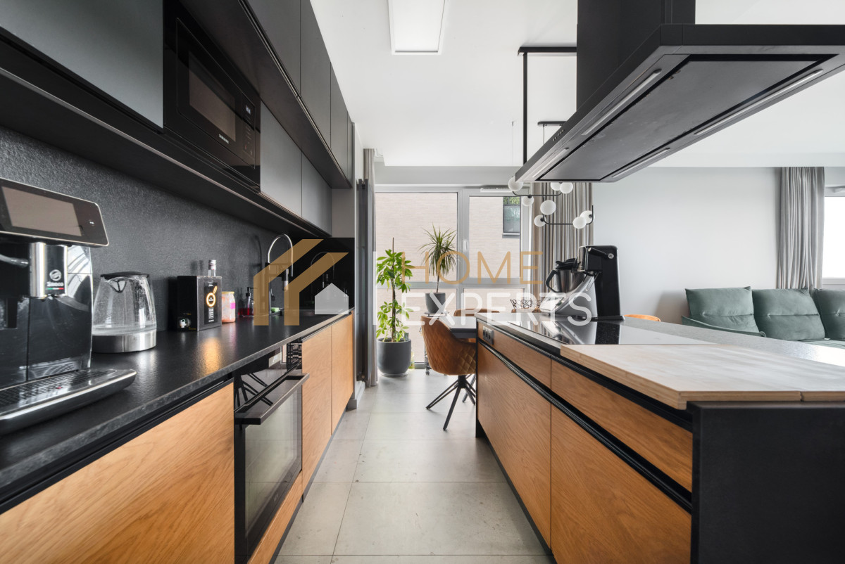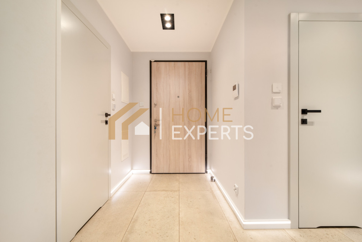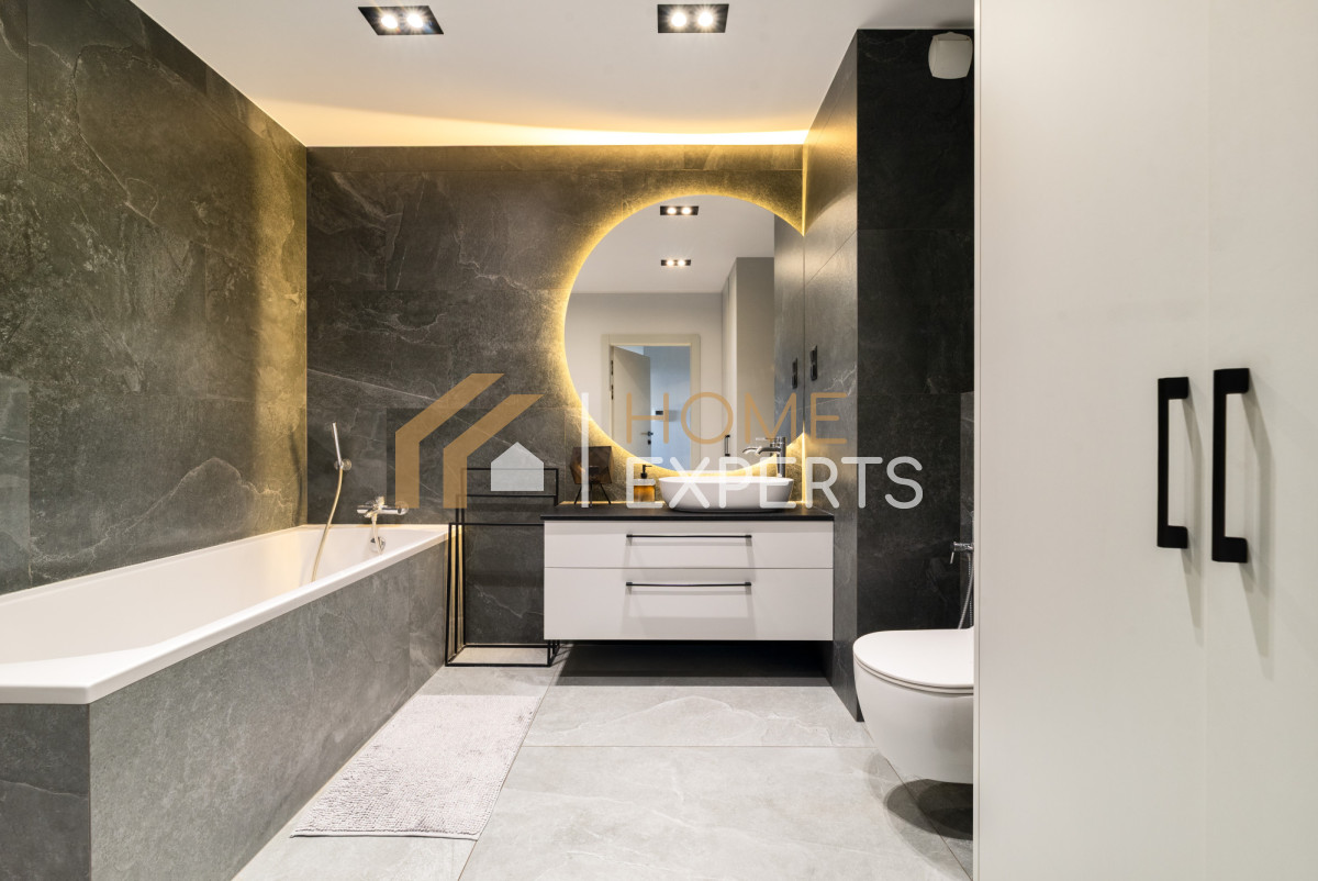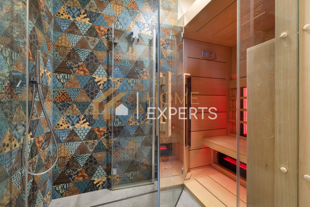 Nowoczesna łazienka została zaprojektowana w eleganckim stylu, a dodatkowym atutem mieszkania jest prywatna sauna, która pozwala zadbać o zdrowie i relaks we własnym domu.