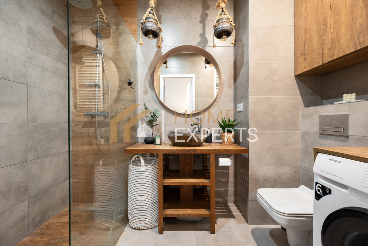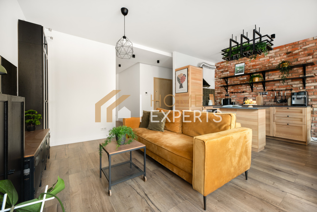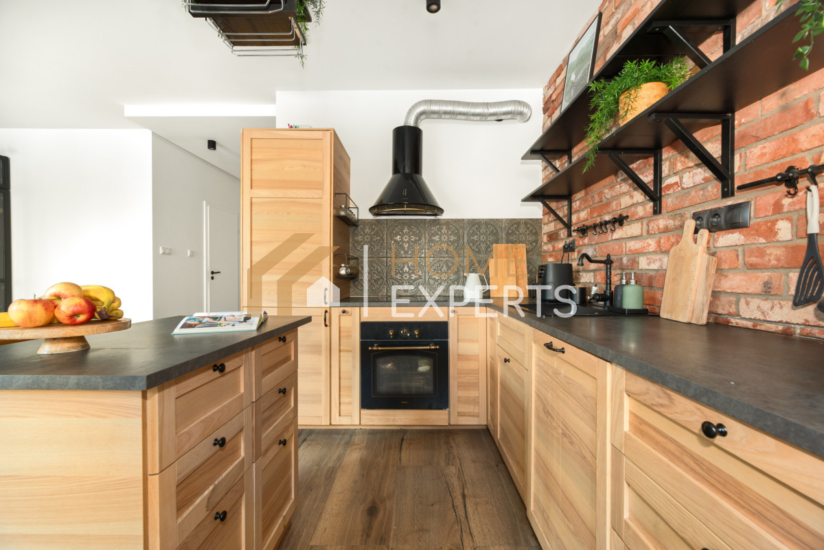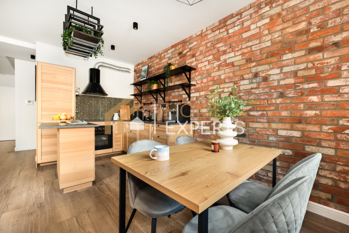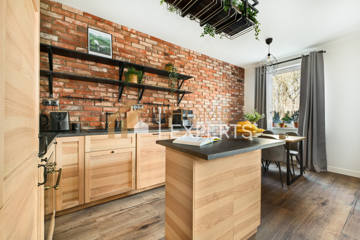 • Ściany w mieszkaniu wykończone są gładzią gipsową, a w salonie dodatkowo dekoracyjną cegiełką. W łazience zastosowano glazurę i terakotę, natomiast na podłogach w pozostałych pomieszczeniach znajdują się panele.