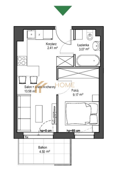 Jeśli szukasz miejsca, które przy niewielkim budżecie zapewni Ci spokojne życie z przestrzenią do relaksu, to mieszkanie jest właśnie dla Ciebie. Poranną kawę wypij na własnym balkonie (4,5m2), który od rana skąpany jest w promieniach słońca. Zaproś gości do salonu z aneksem kuchennym (13,58m2) podczas gdy sypialnia (9,17m2) pozwoli Ci zachować odrobinę prywatności dla siebie. W mieszkaniu znajduje się także łazienka (3,07m2) oraz korytarz z miejscem na dużą szafę. Lokal jest jednostronny, zorientowany na południowy-wschód.