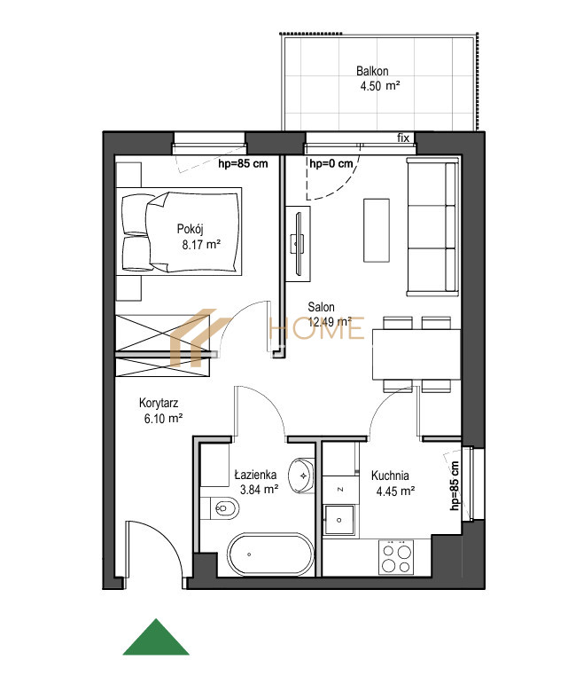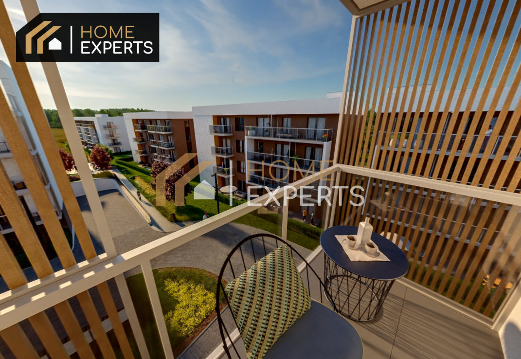 Z okien mieszkania rozciąga się pełen uroku widok niezmącony wysoką zabudową. Jasny salon (12,49m2) prowadzi na balkon (4,5m2) o zachodniej orientacji. Na tę stronę świata wychodzą również okna sypialni (8,17m2). Znajdziemy tu także osobną kuchnię z dużym północnym oknem. W mieszkaniu znajduje się również łazienka (3,84m2) oraz korytarz z miejscem na dużą szafę. Lokal jest dwustronny, a jego mieszkańcy cieszą się słońcem do późnych godzin wieczornych.
