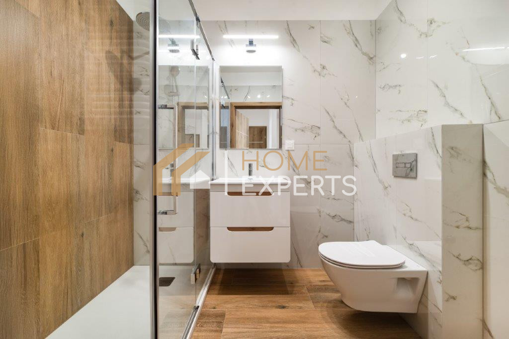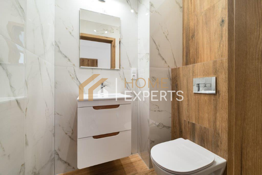 Łazienka z WC i WC w pełni wykończone z kabiną i białym montażem.