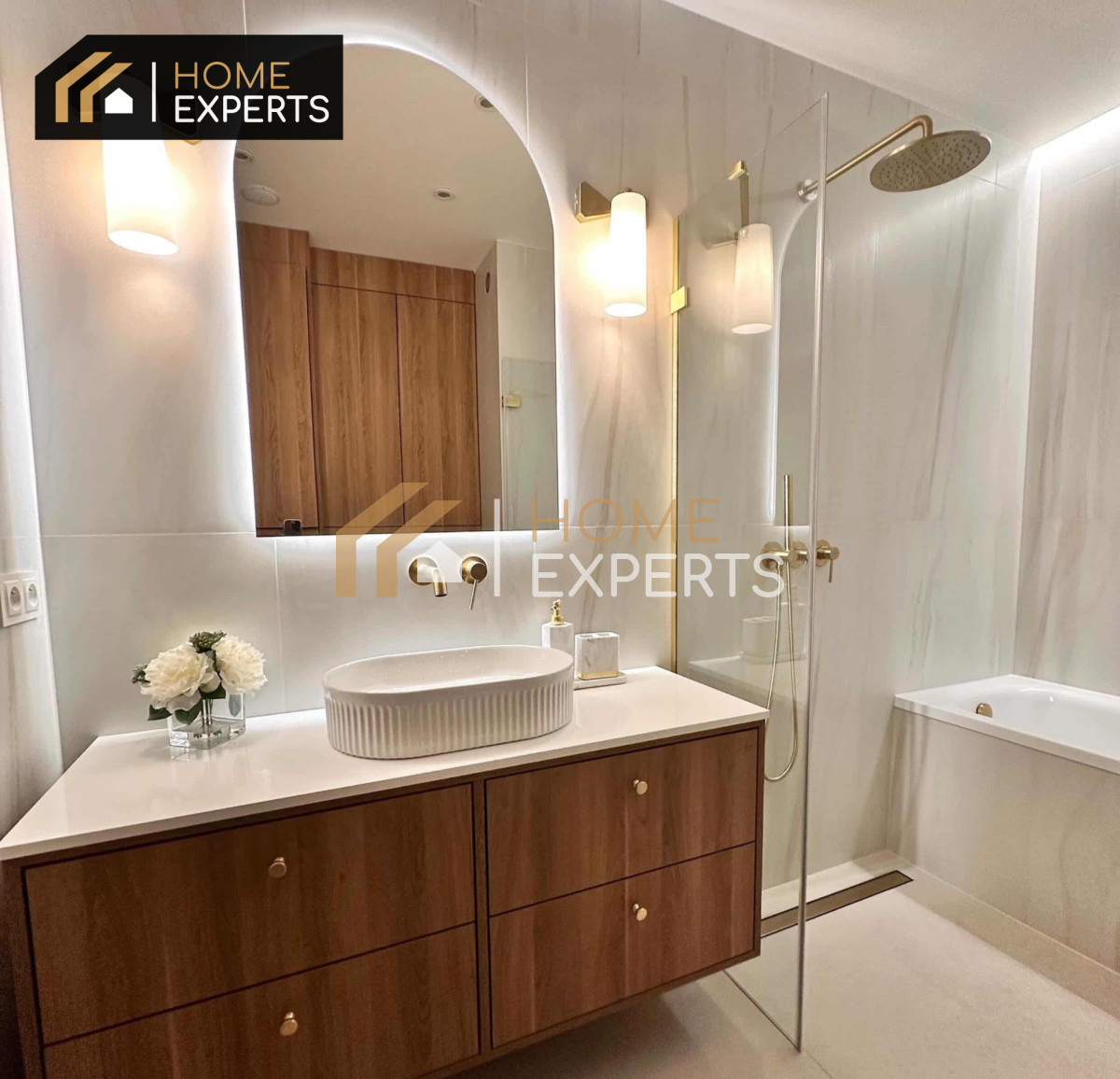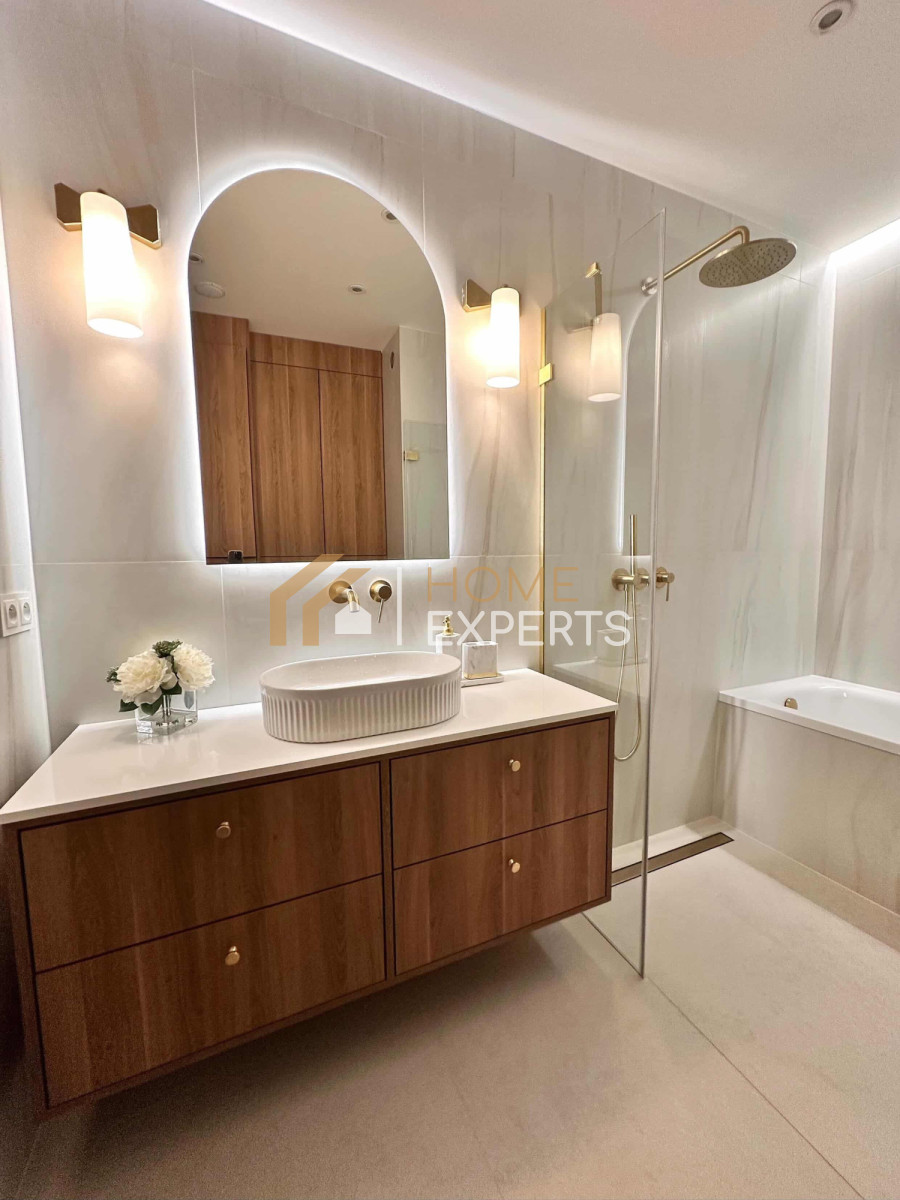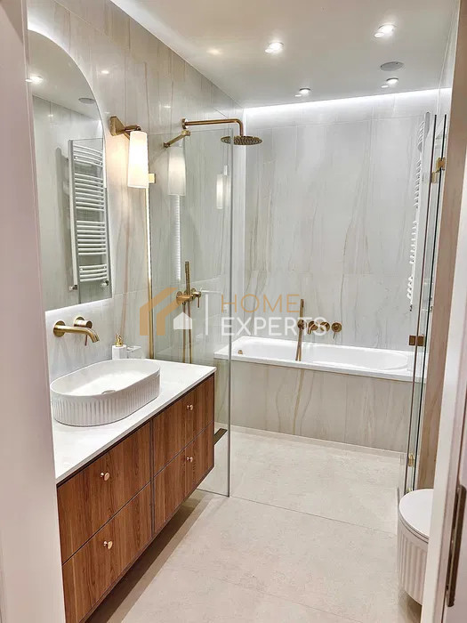 Wanna i przeszklony prysznic, ogrzewanie podłogowe, podwieszana misa WC, umywalka nablatowa i szafki z głębokimi szufladami.