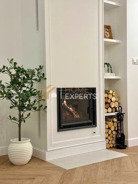 Przestronny salon z komfortową rozkładaną sofą, komodą RTV oraz wydajnym kominkiem 8 kW.