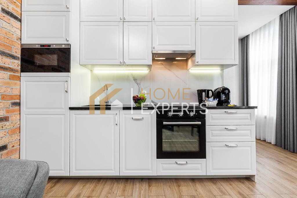 Aneks kuchenny: zabudowa kuchenna wraz ze sprzętem AGD (piekarnik, płyta indukcyjna, lodówka z zamrażarką, zmywarka, mikrofala, okap, ekspres do kawy, czajnik), podstawowa zastawa stołowa,